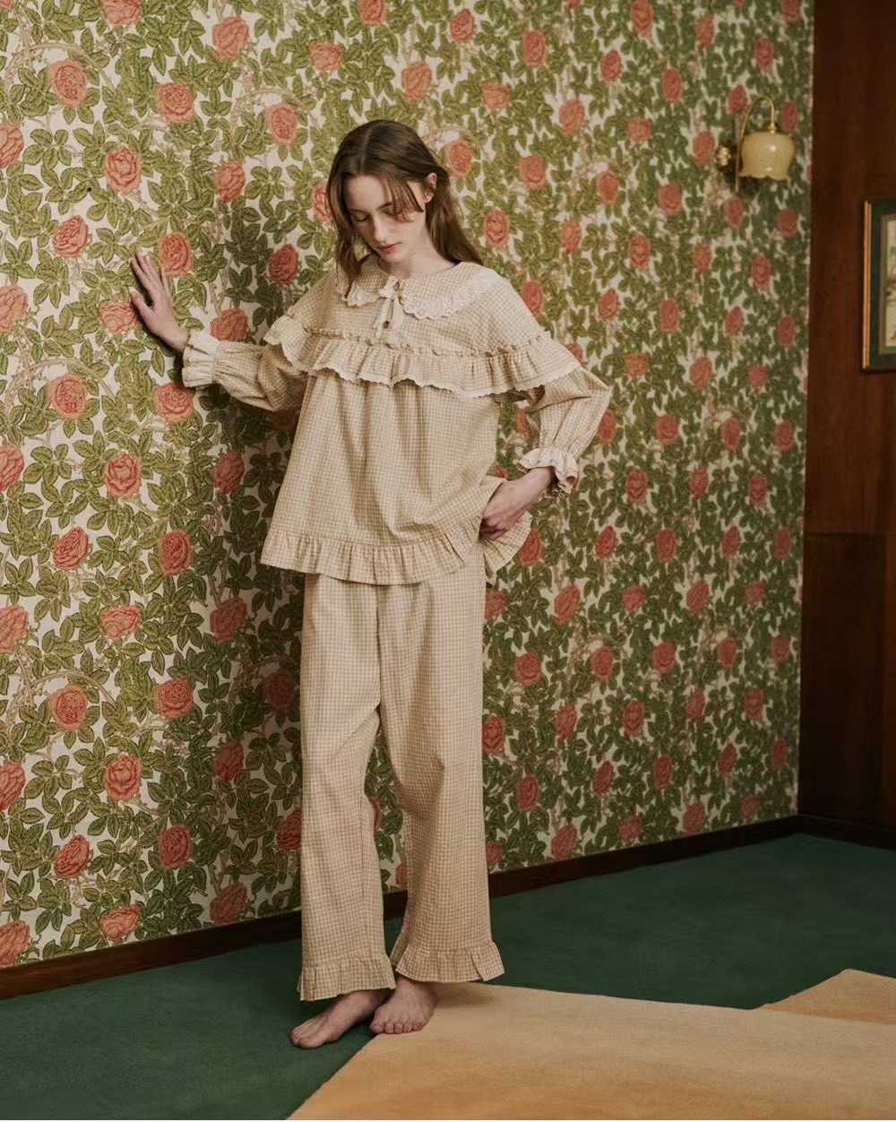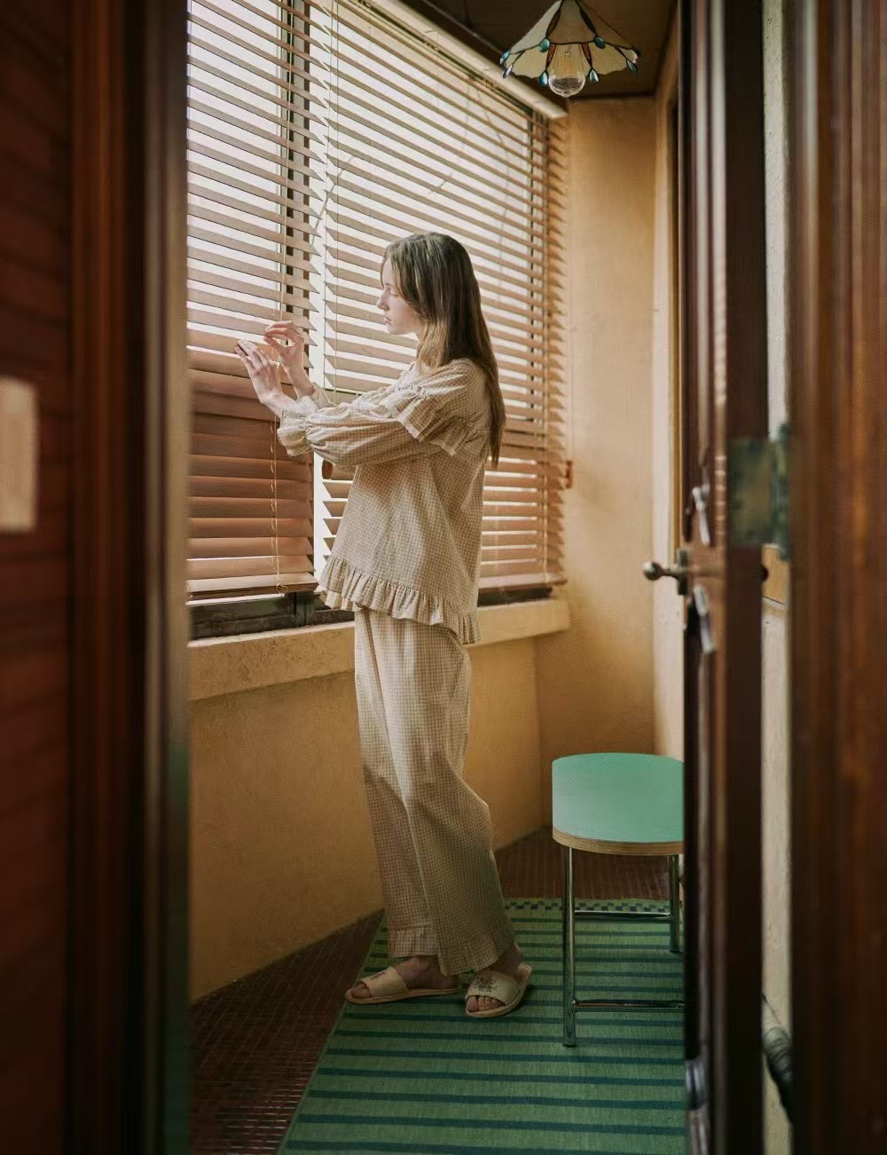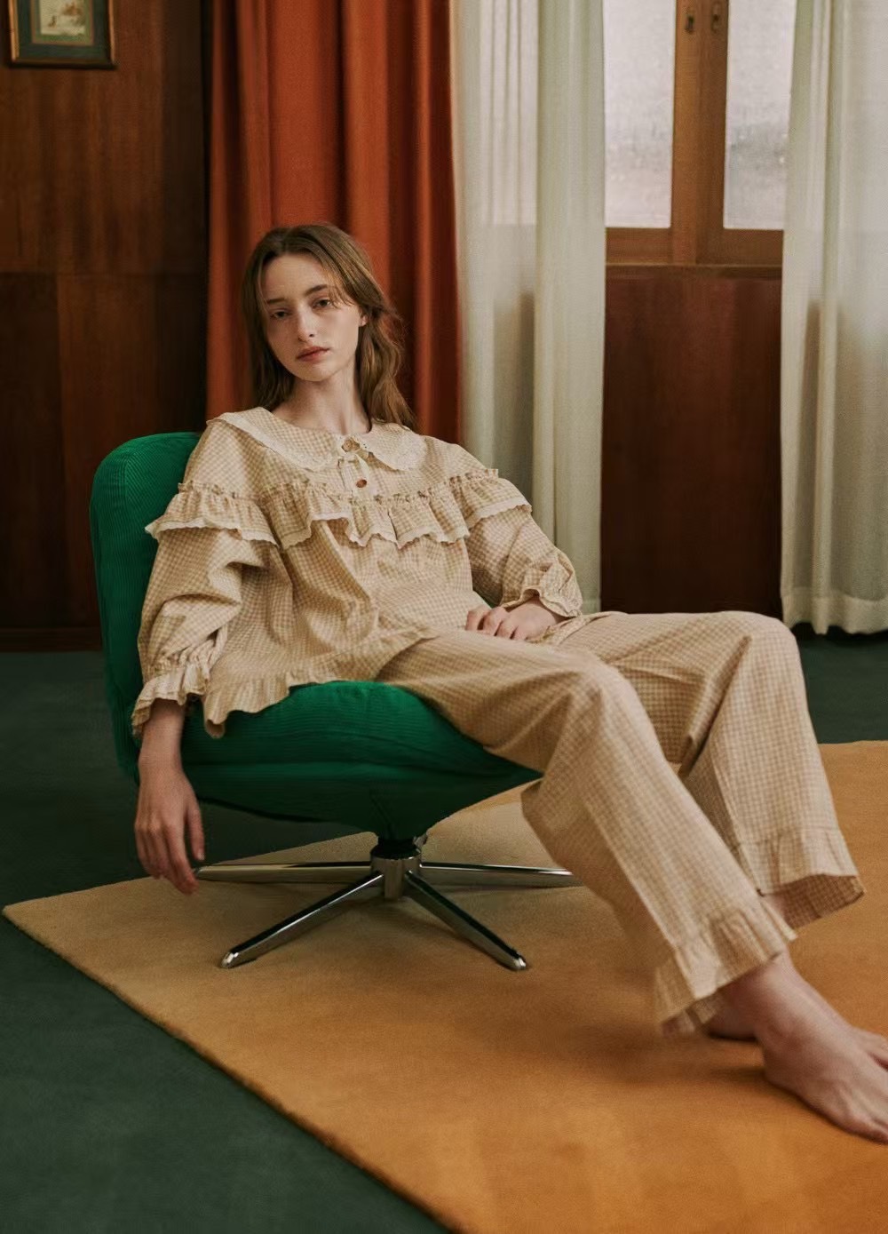 下襬與褲口荷葉邊,俏皮又浪漫,完整呼應整體復古氛圍。。