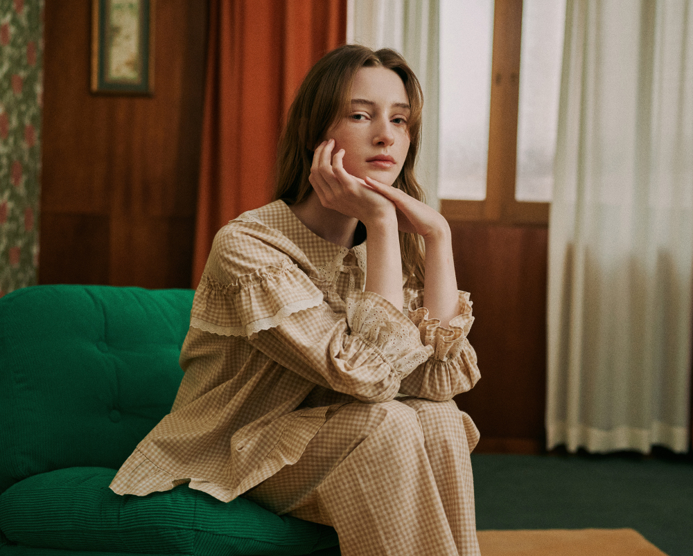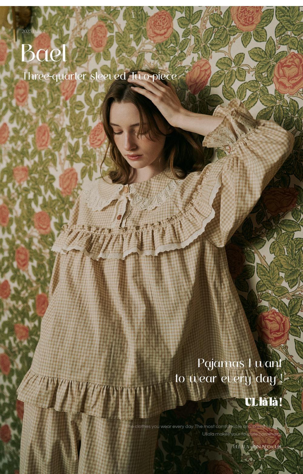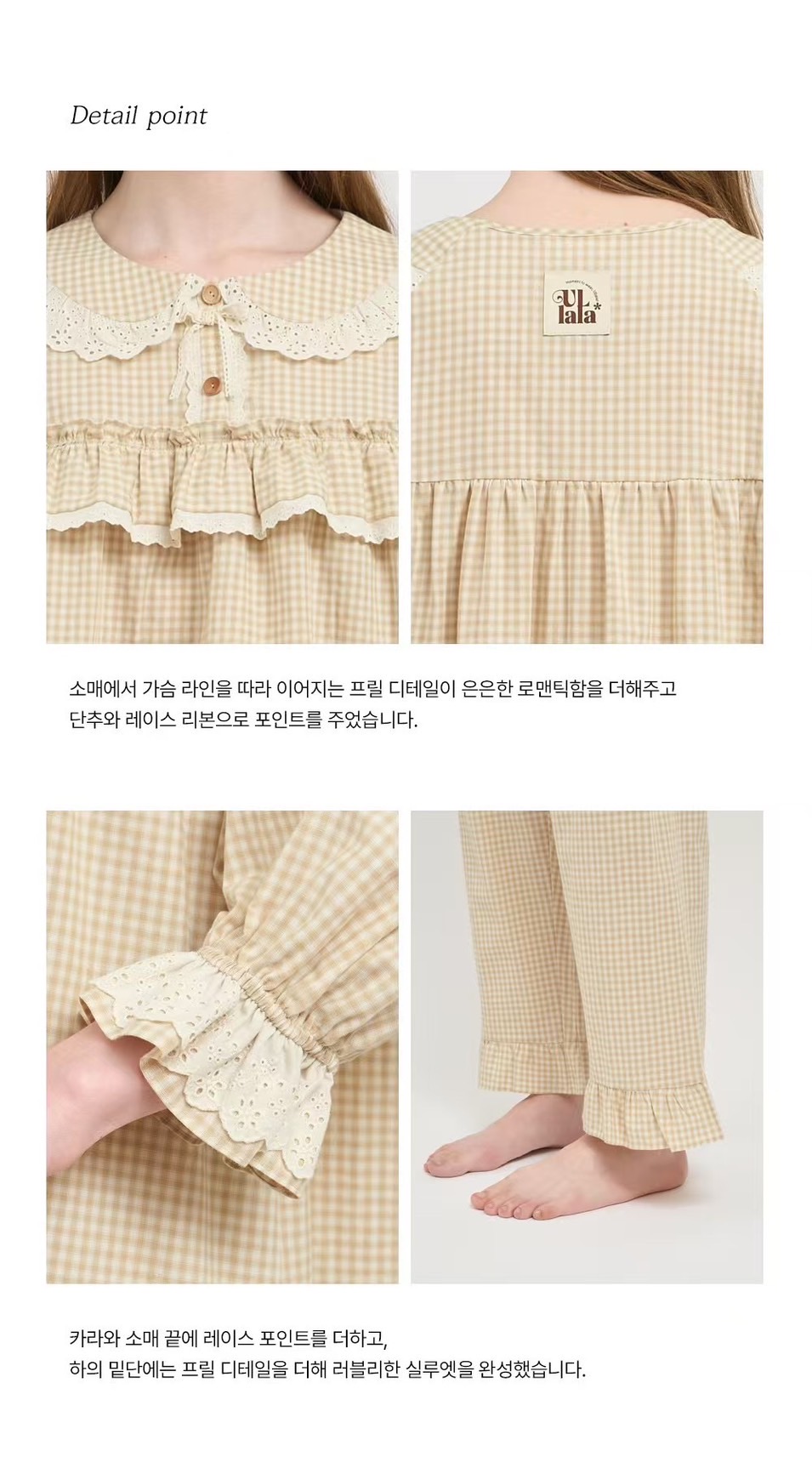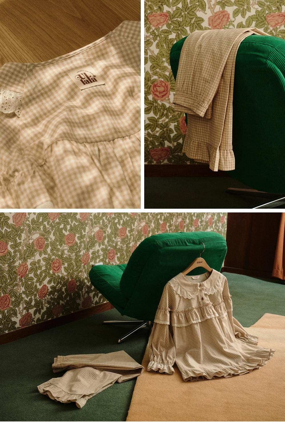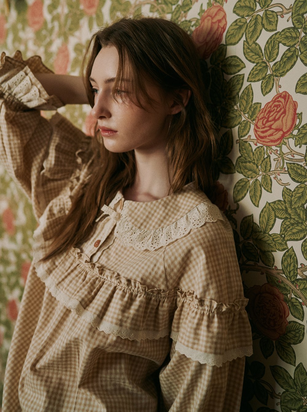 圓領加大領片,搭配蕾絲與荷葉邊,展現細膩的復古氣質。