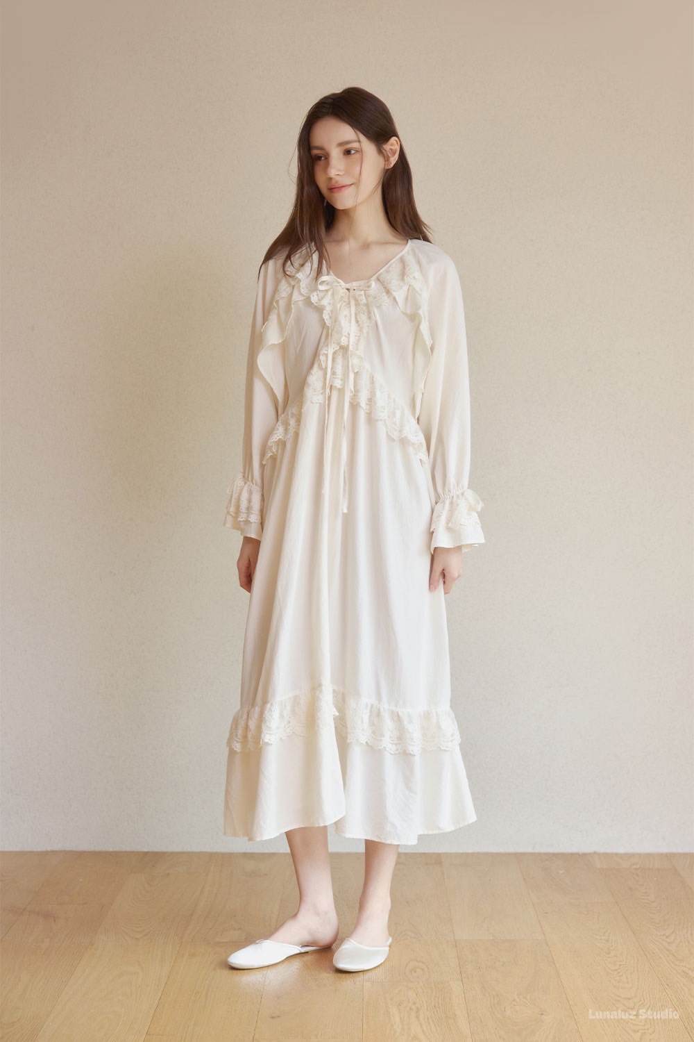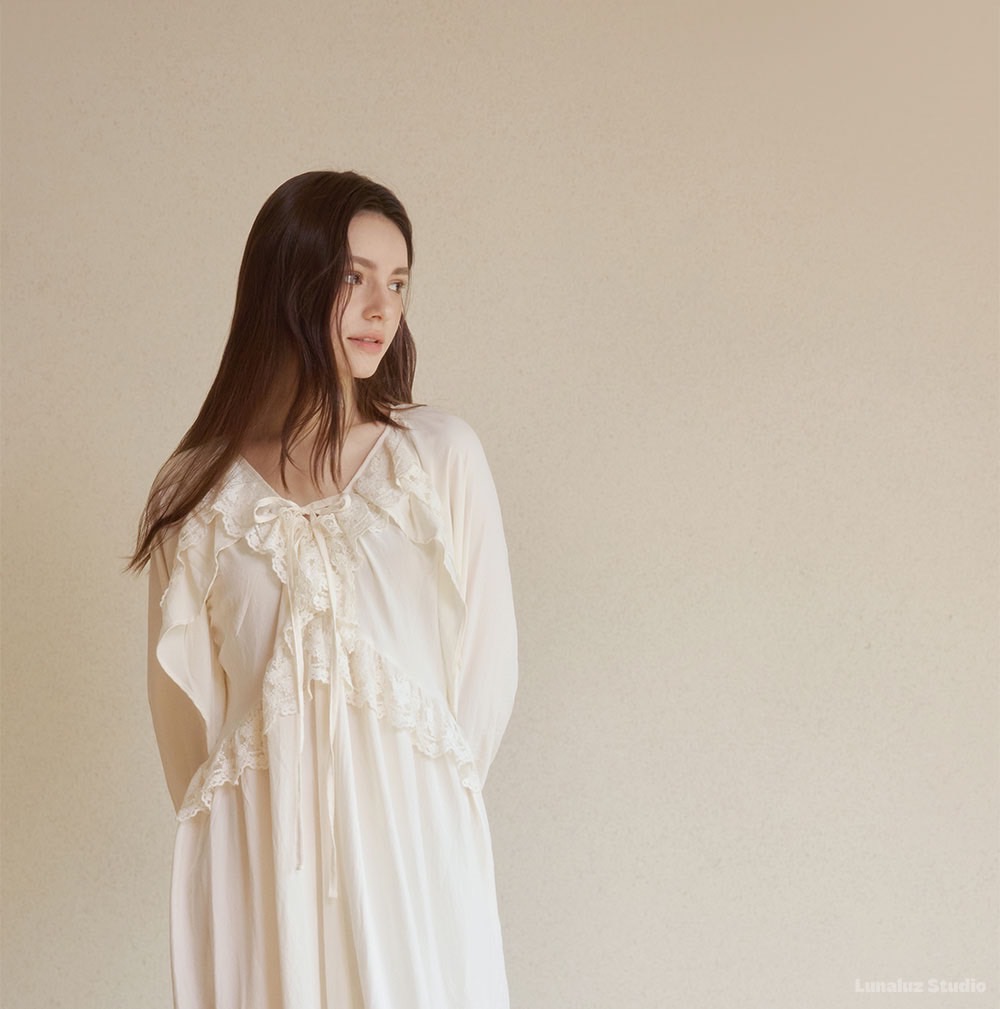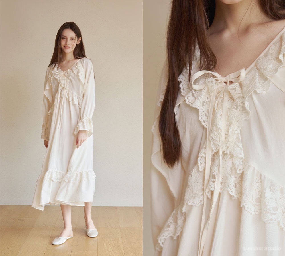 LUNALUZ 奶油香頌蕾絲綁帶睡衣洋裝