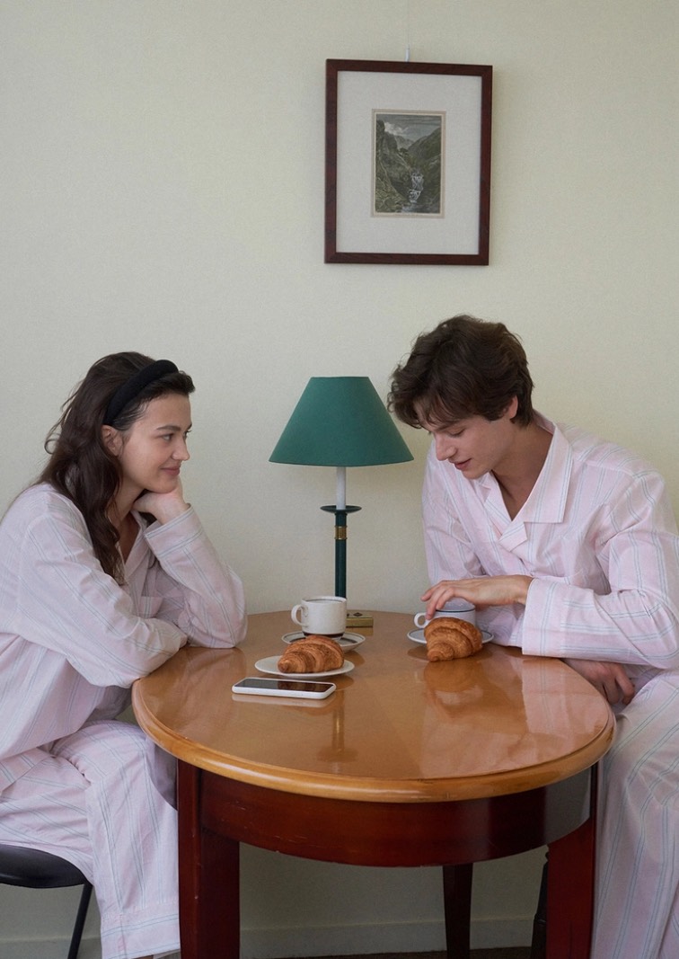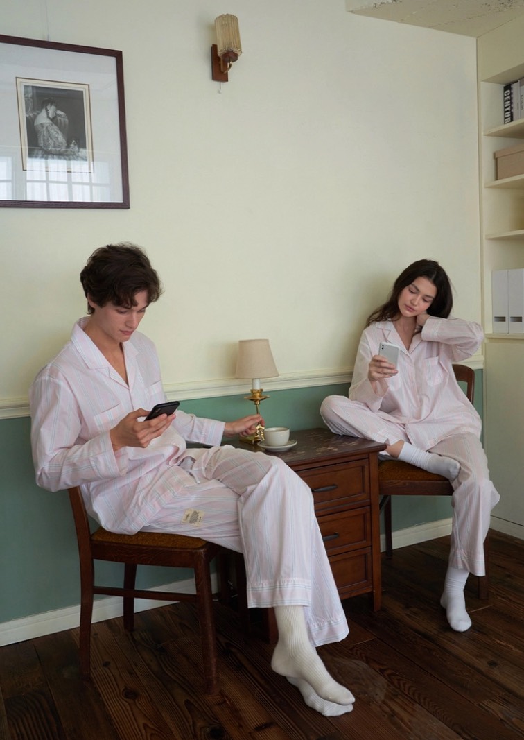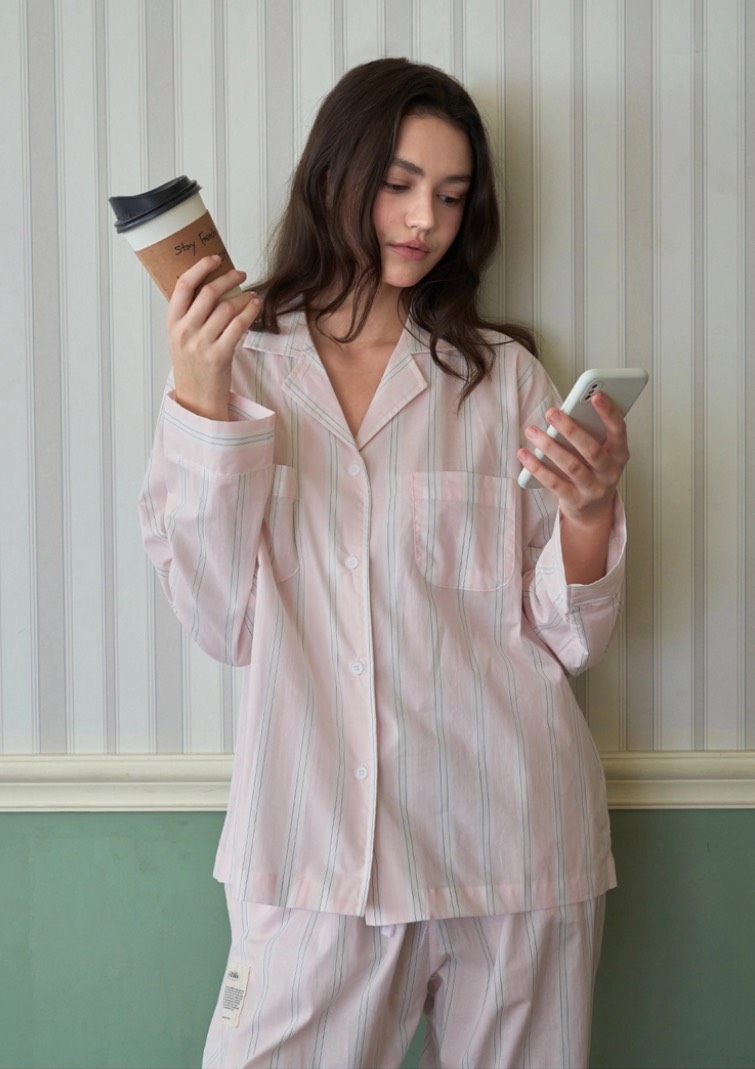 這套睡衣的設計語言在於「中性寬鬆 × 知性感 × 柔粉優雅」,