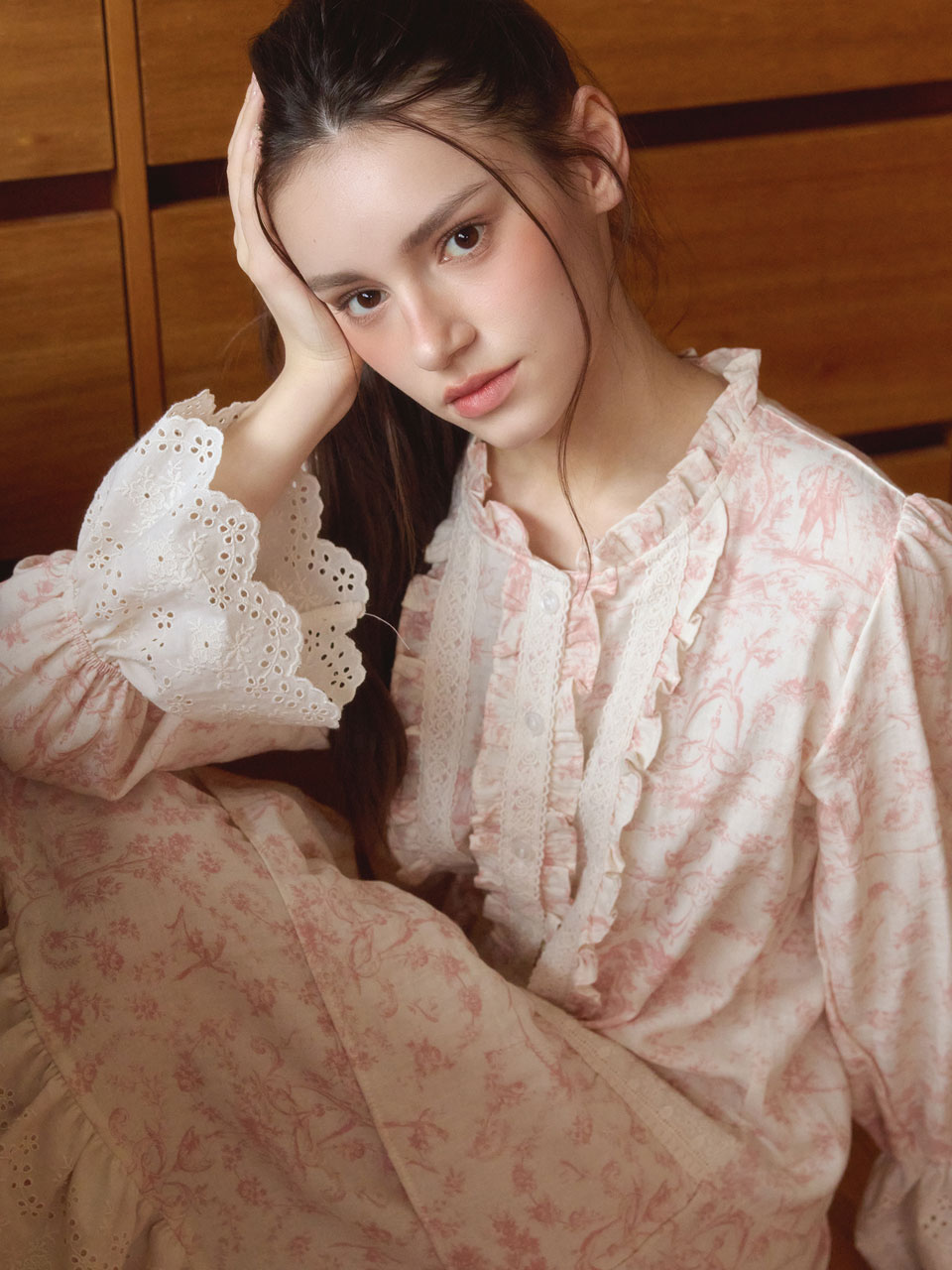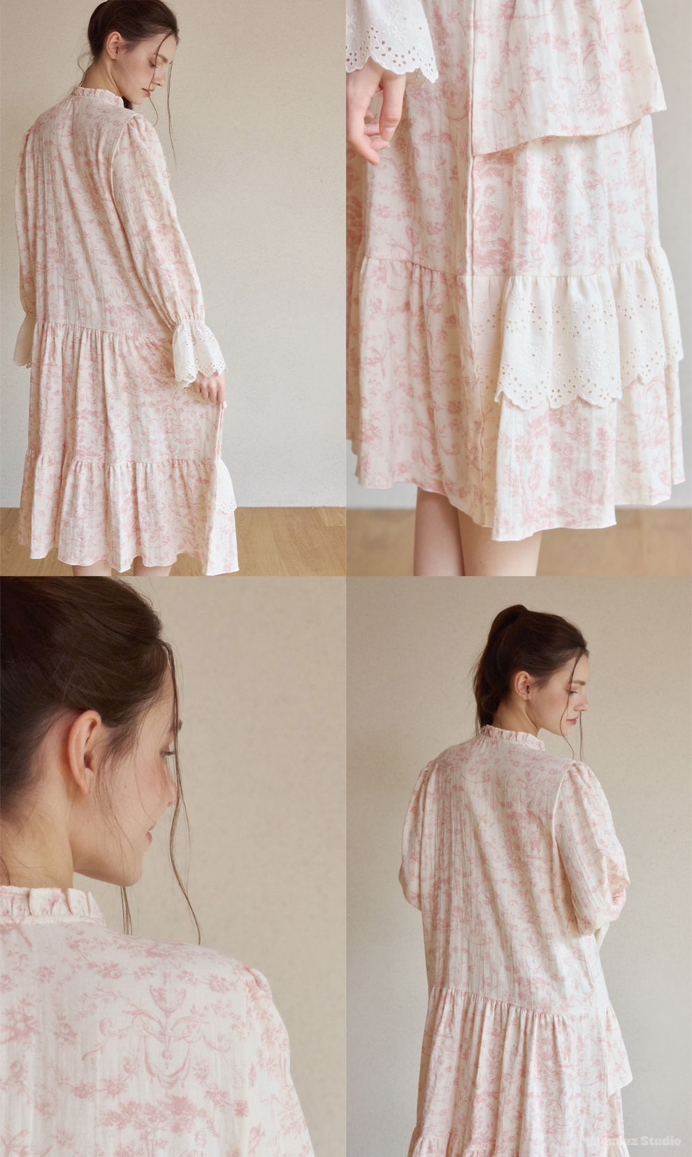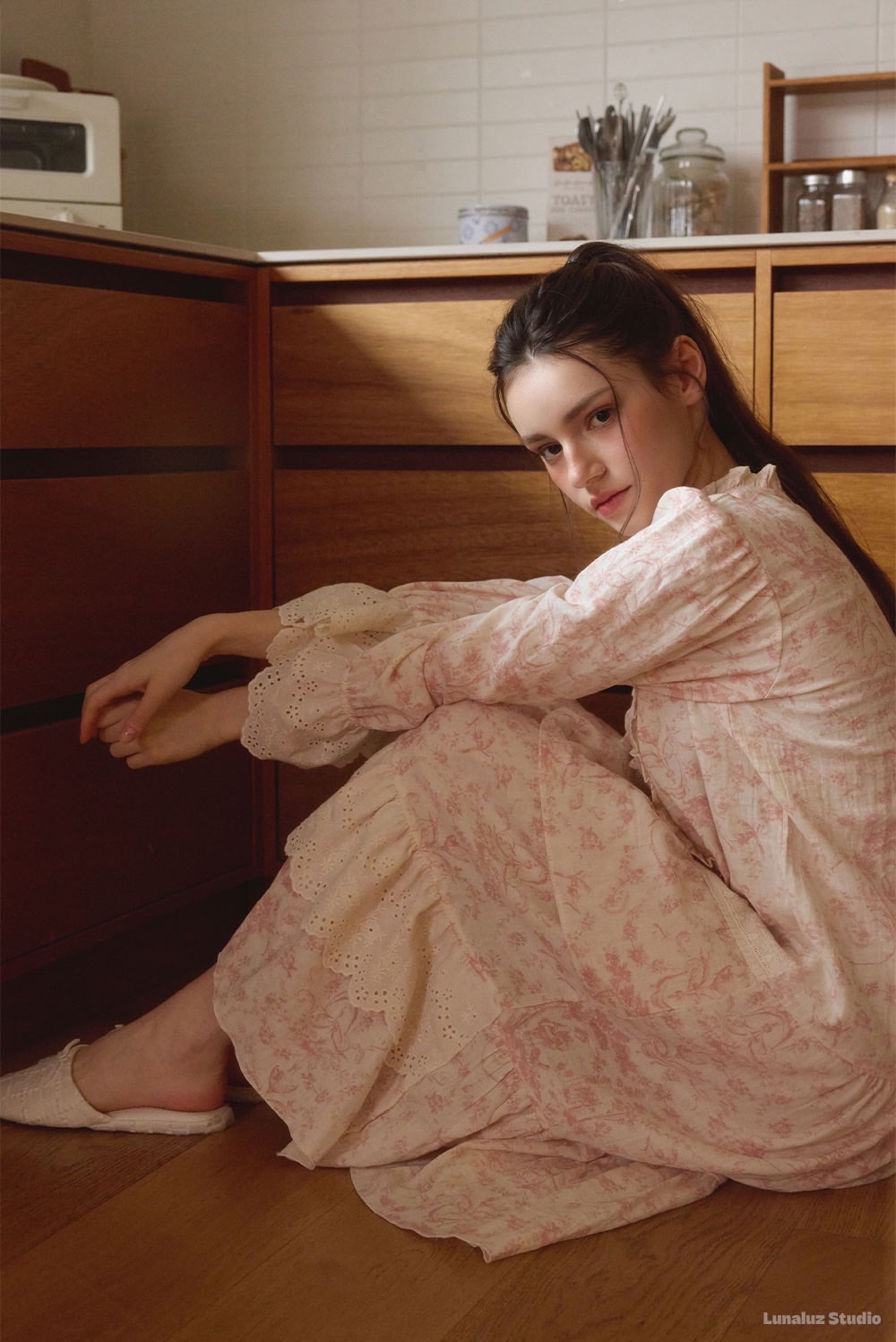 LUNALUZ 粉紅朱依紋印花棉質蕾絲睡衣洋裝