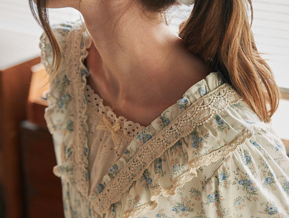 立體蕾絲V領+前胸褶皺設計,勾勒出柔和頸線與復古氣質。