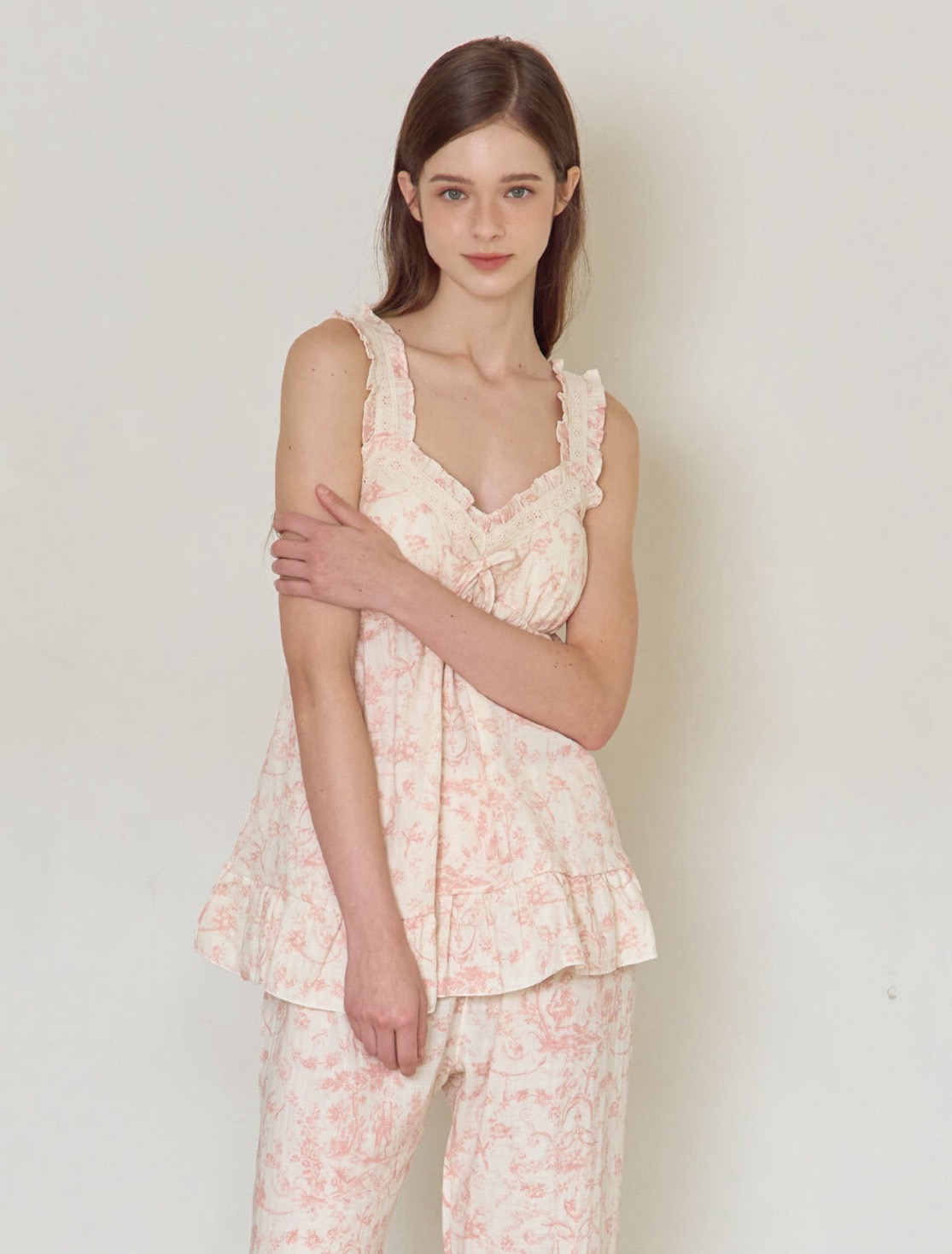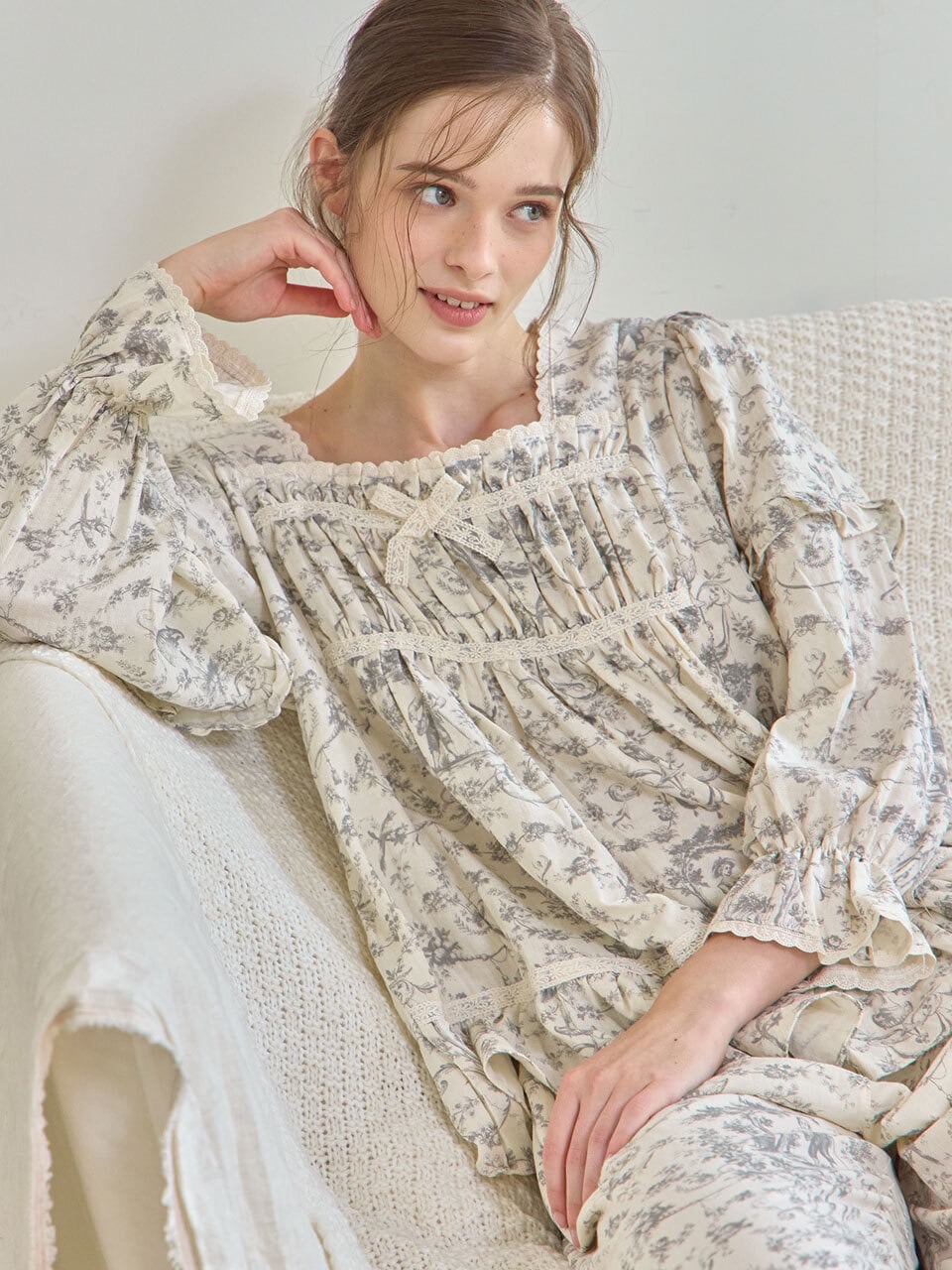經典襯衫式睡衣版型,搭配粉嫩森林印花,帶出清新優雅氛圍。