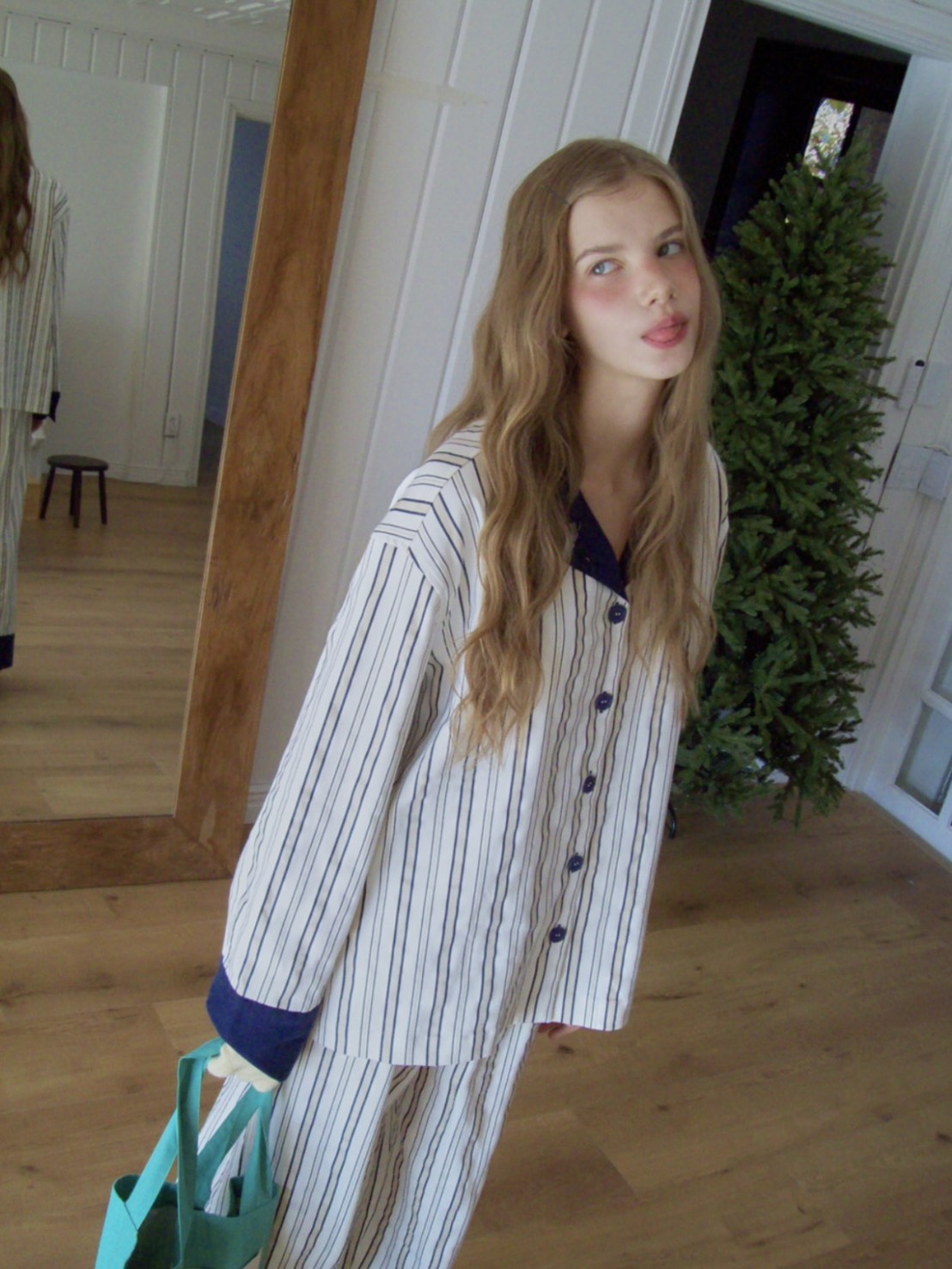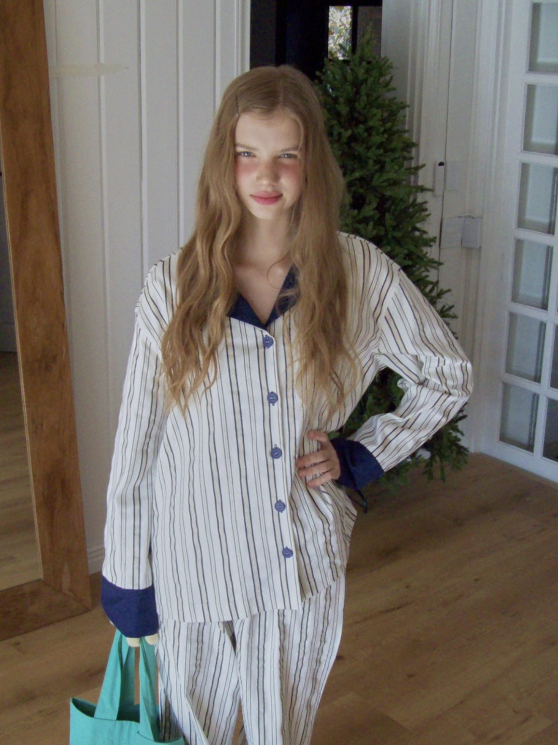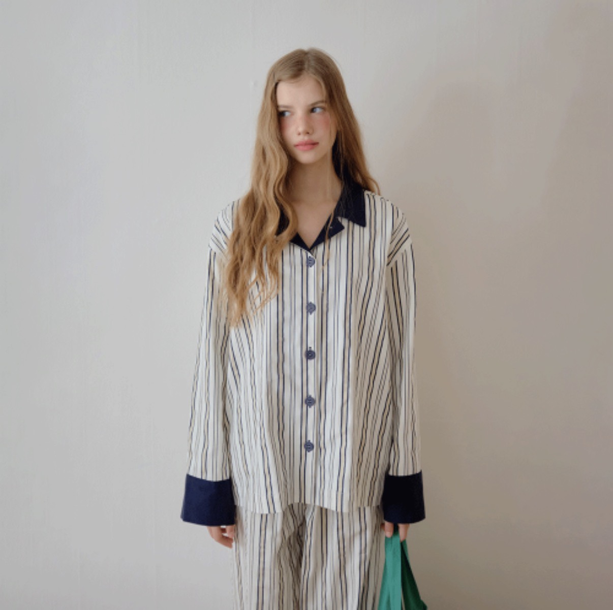 深藍色的領口與袖口,就像在溫柔底色上落下一筆筆穩重描線,