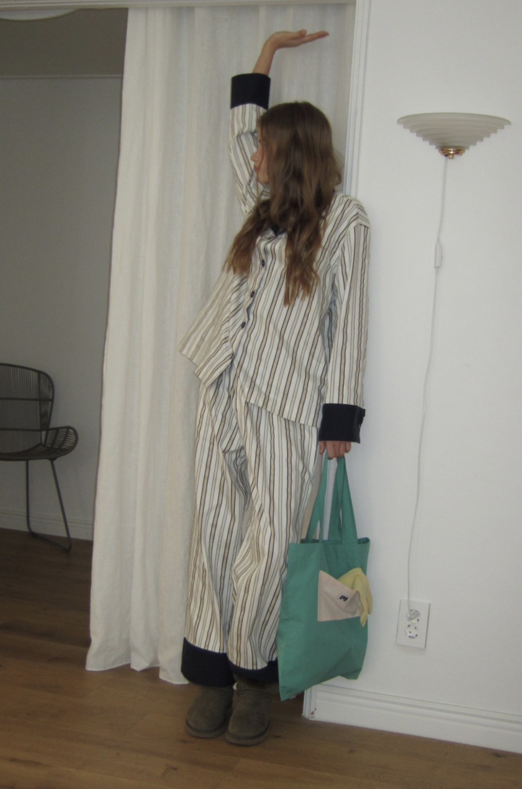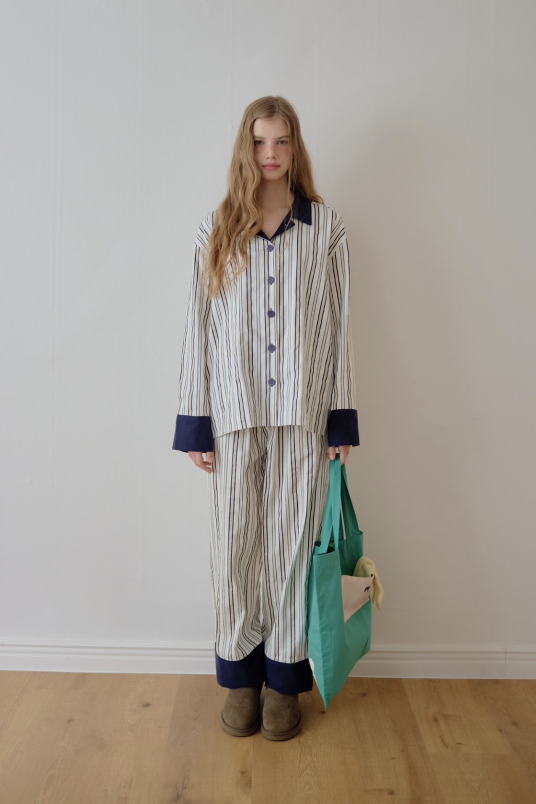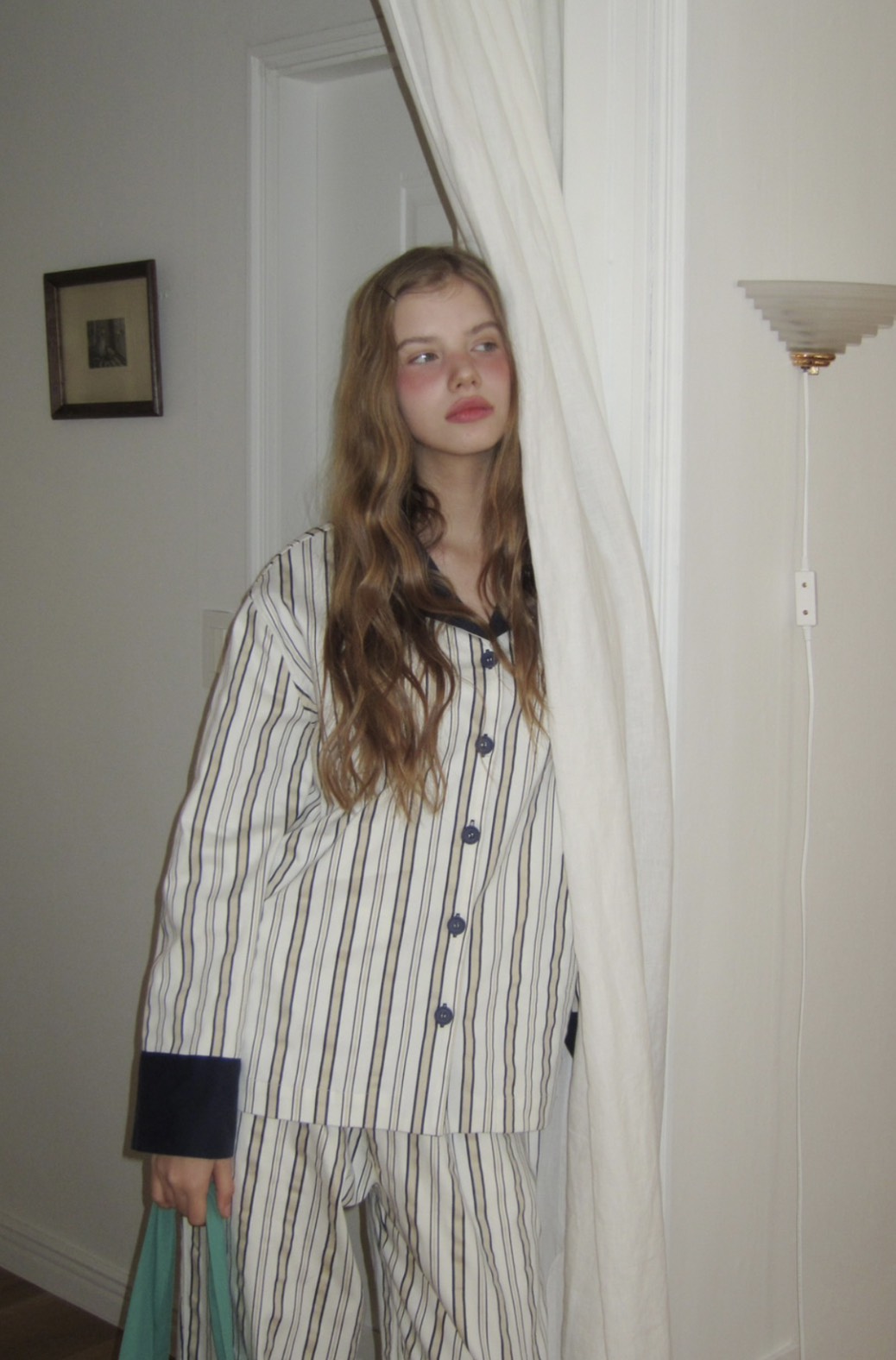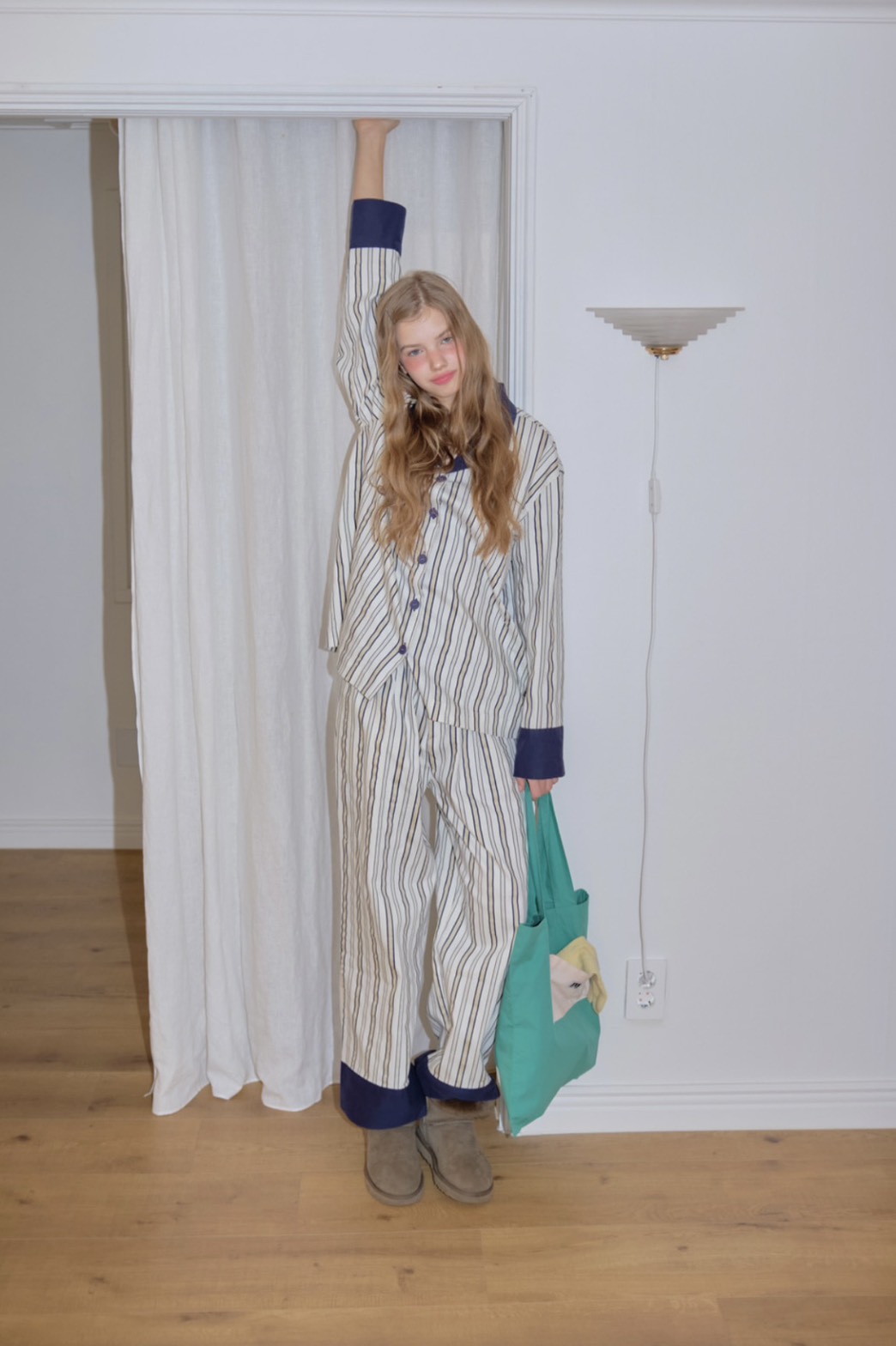深藍色的領口與袖口,就像在溫柔底色上落下一筆筆穩重描線,