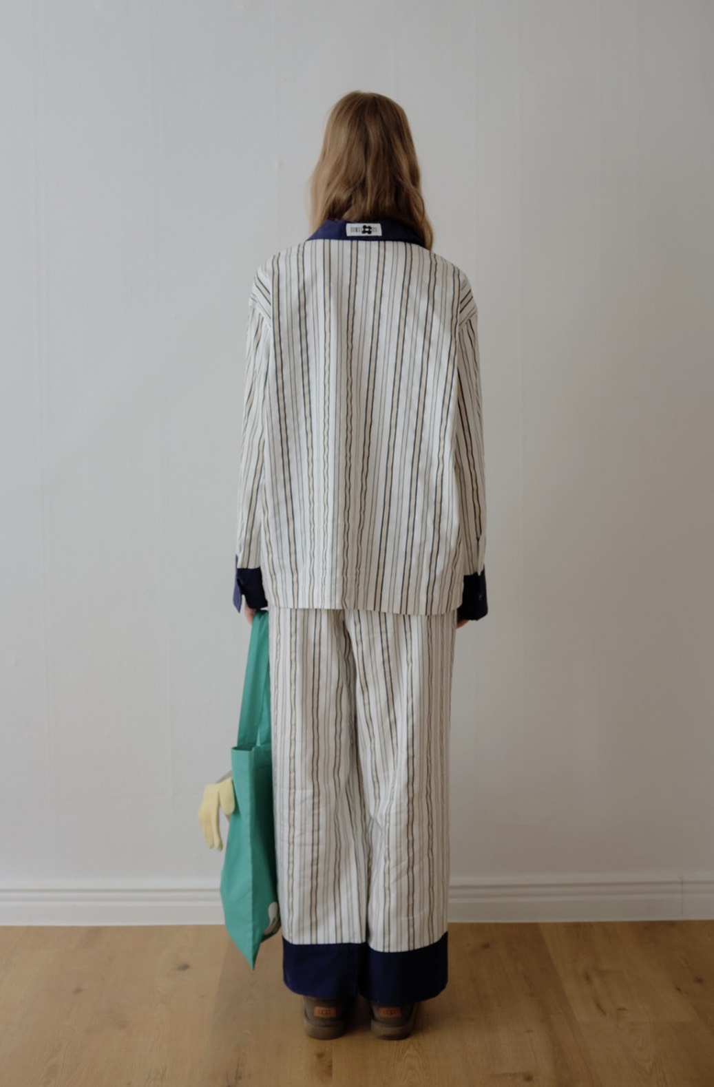 在領口、袖口、排扣與條紋之間加入輕巧的配色變化,