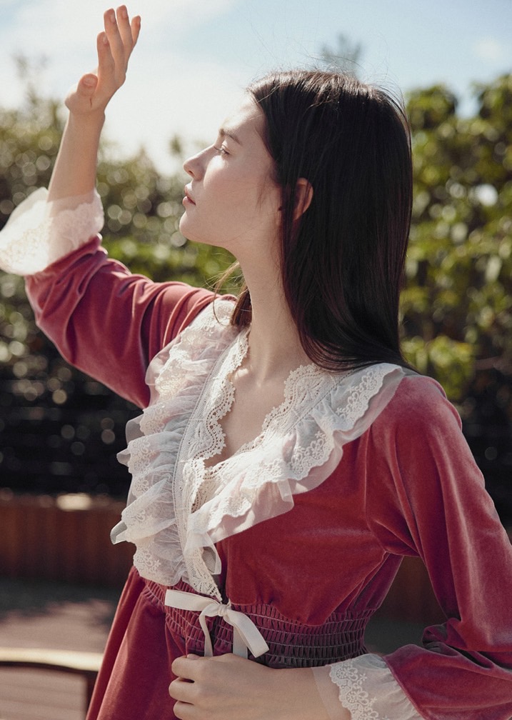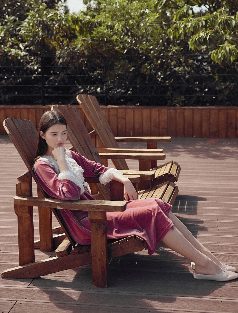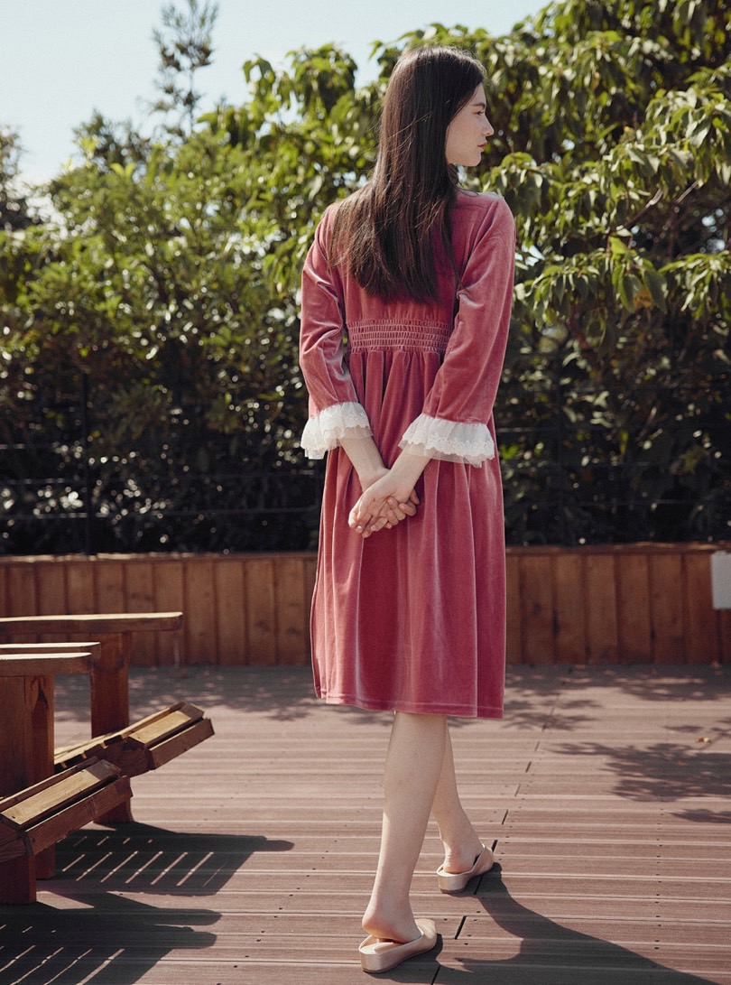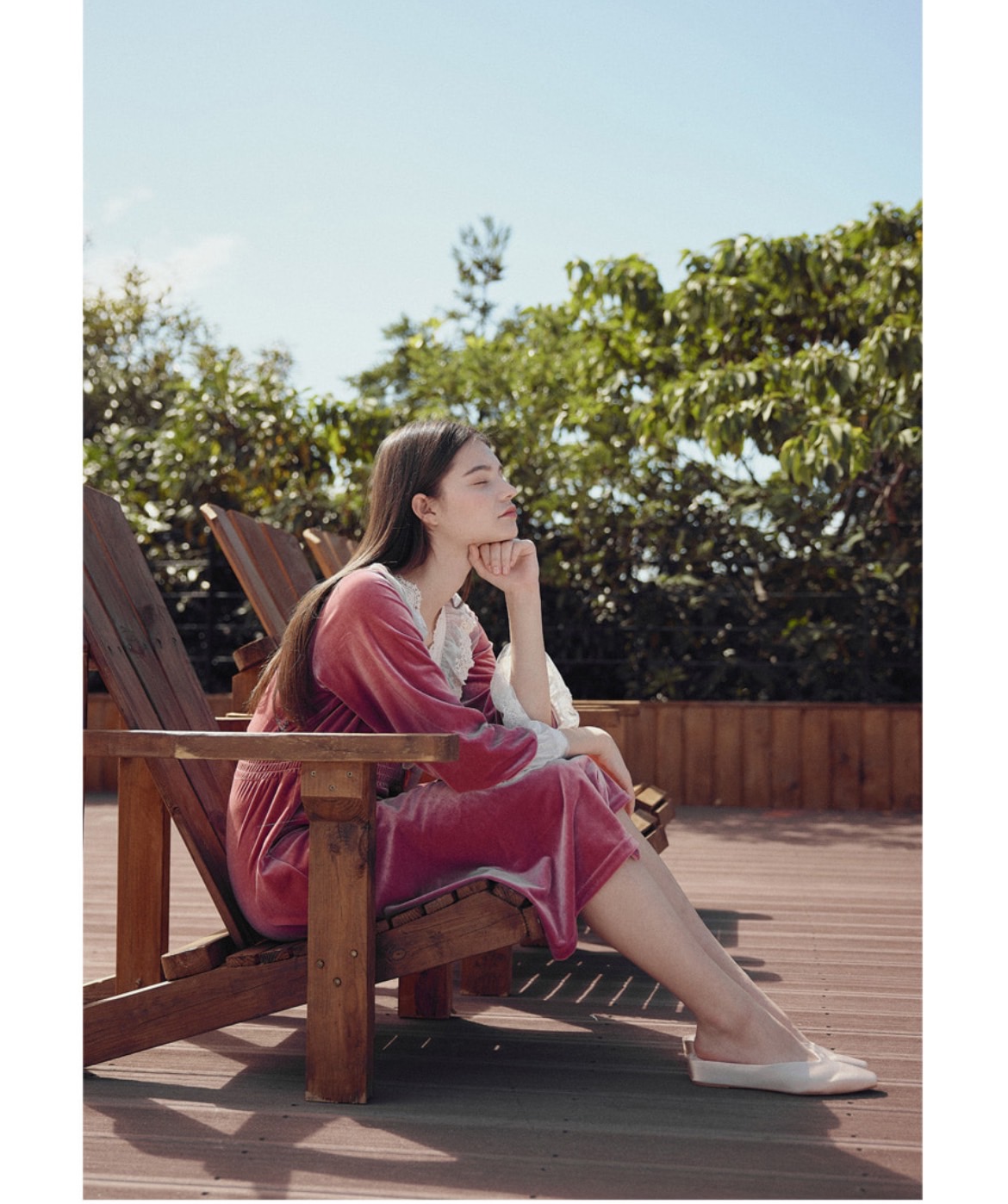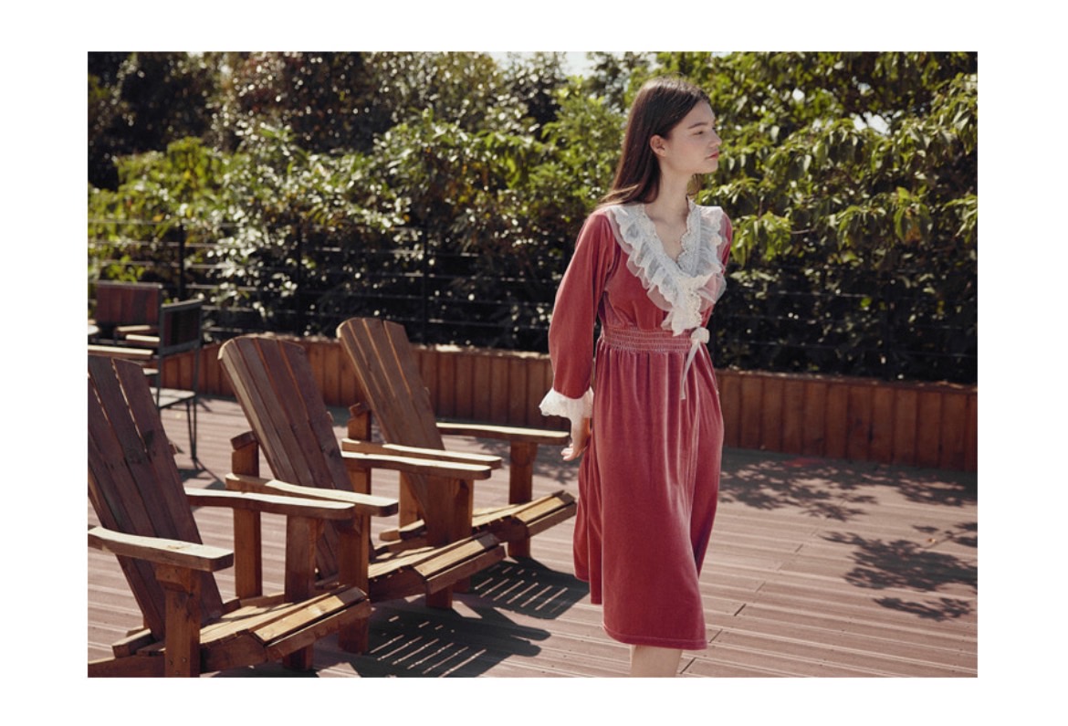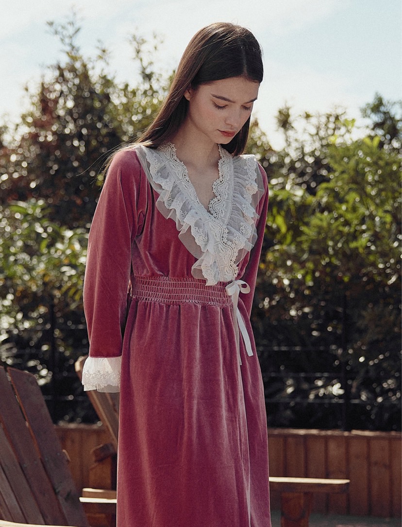 BALCONY 薄暮玫瑰天鵝絨蕾絲睡袍