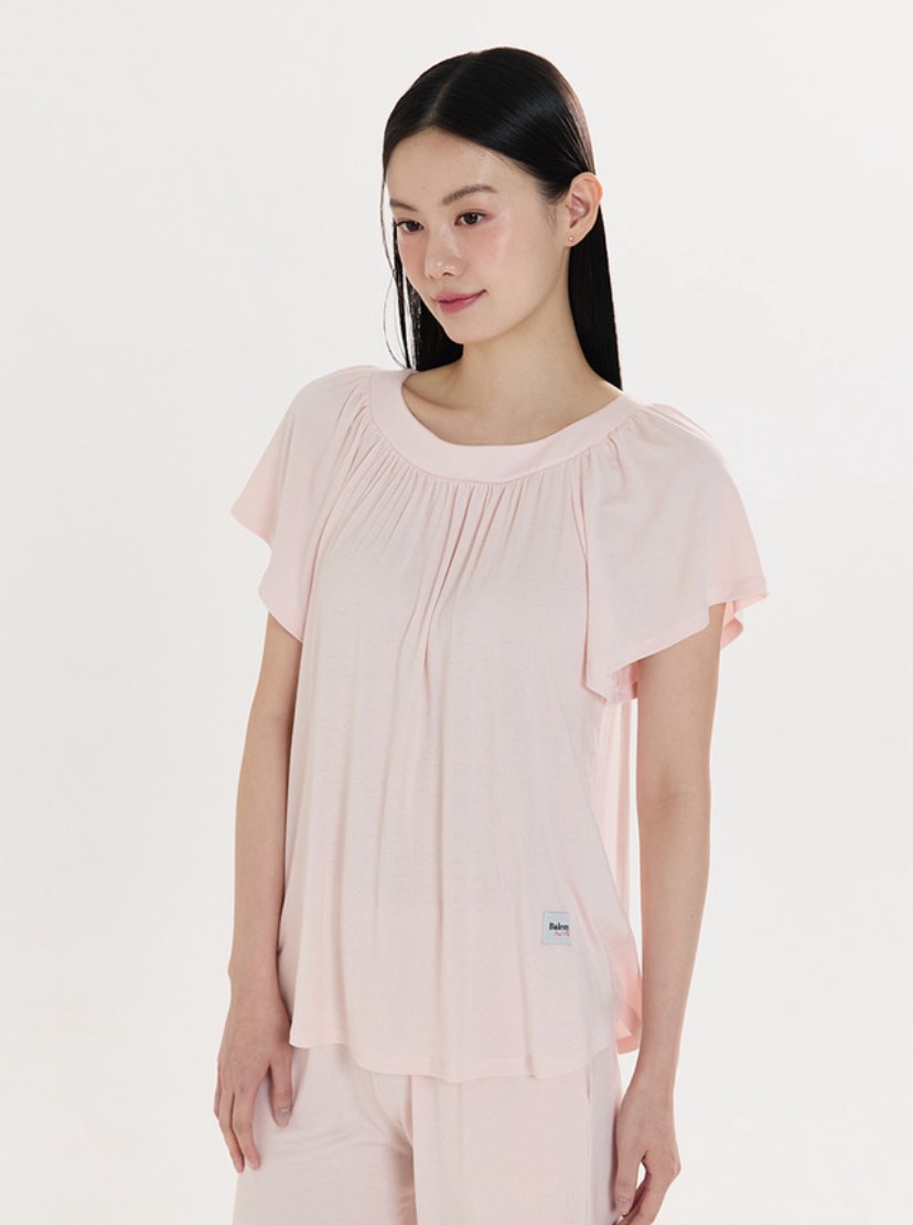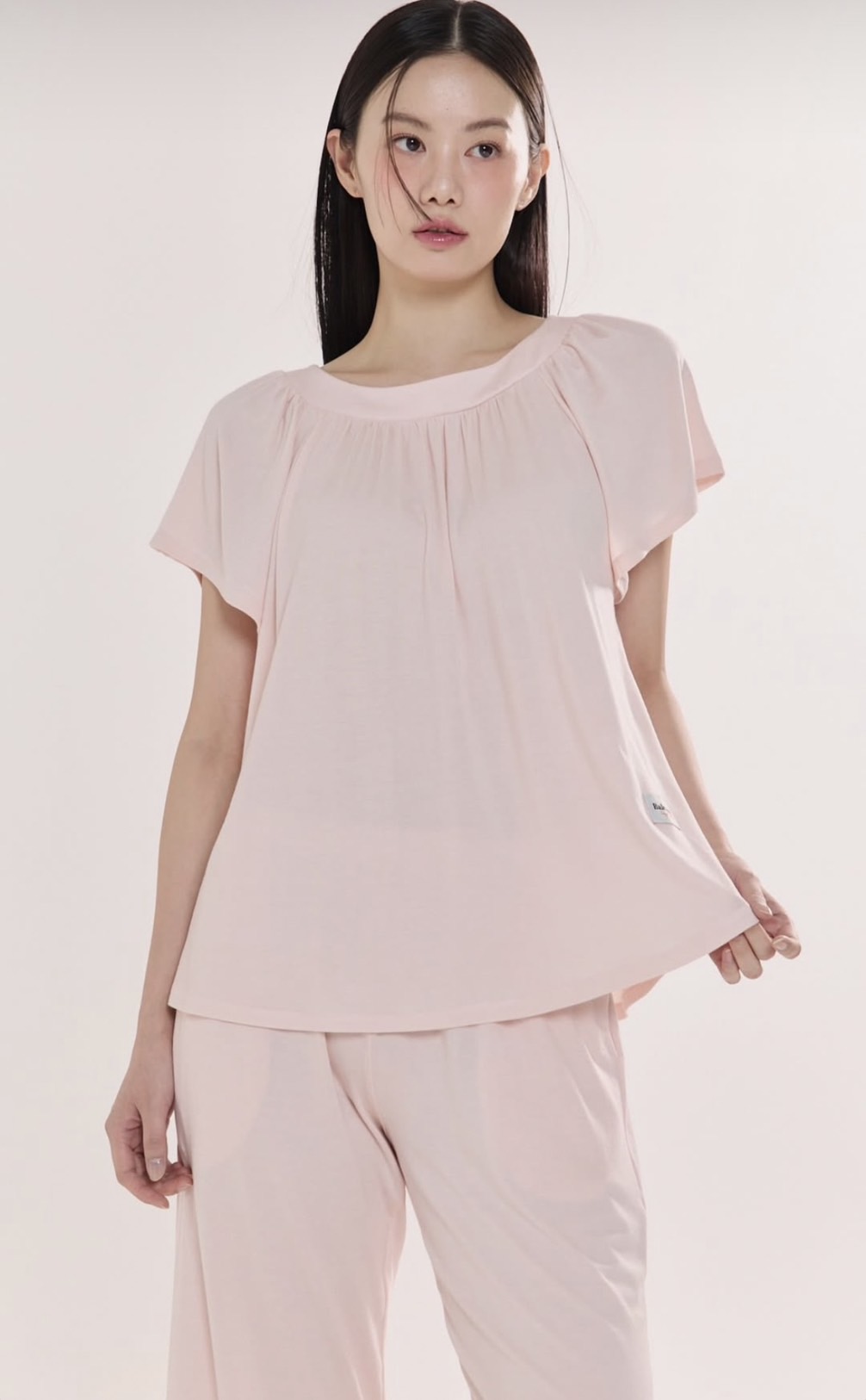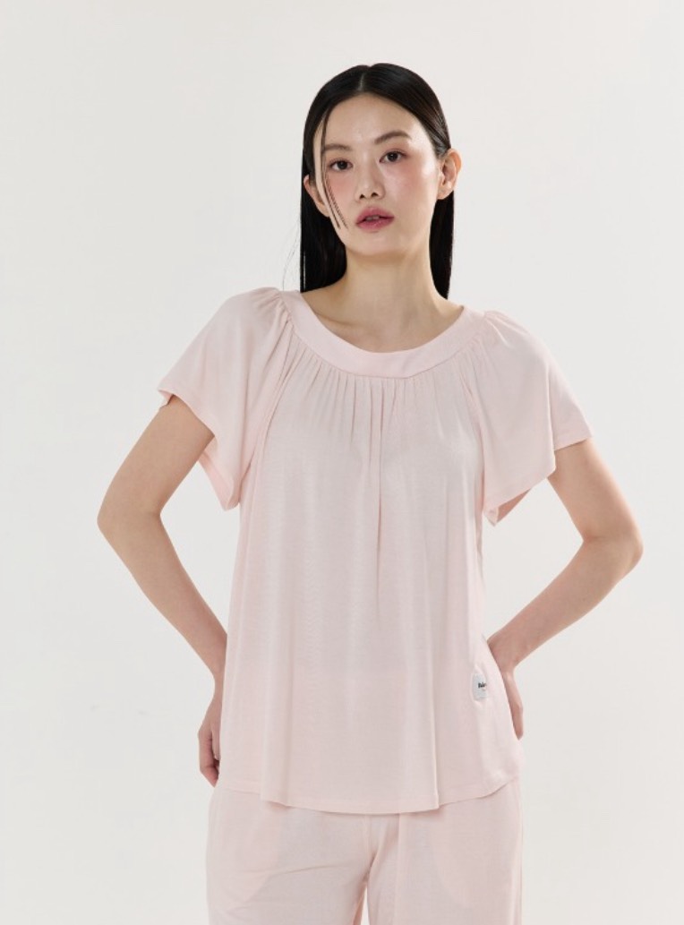 上衣採優雅圓領設計,細緻抓皺讓視覺更輕盈飄逸,袖口微寬不拘束,打造極佳活動度;