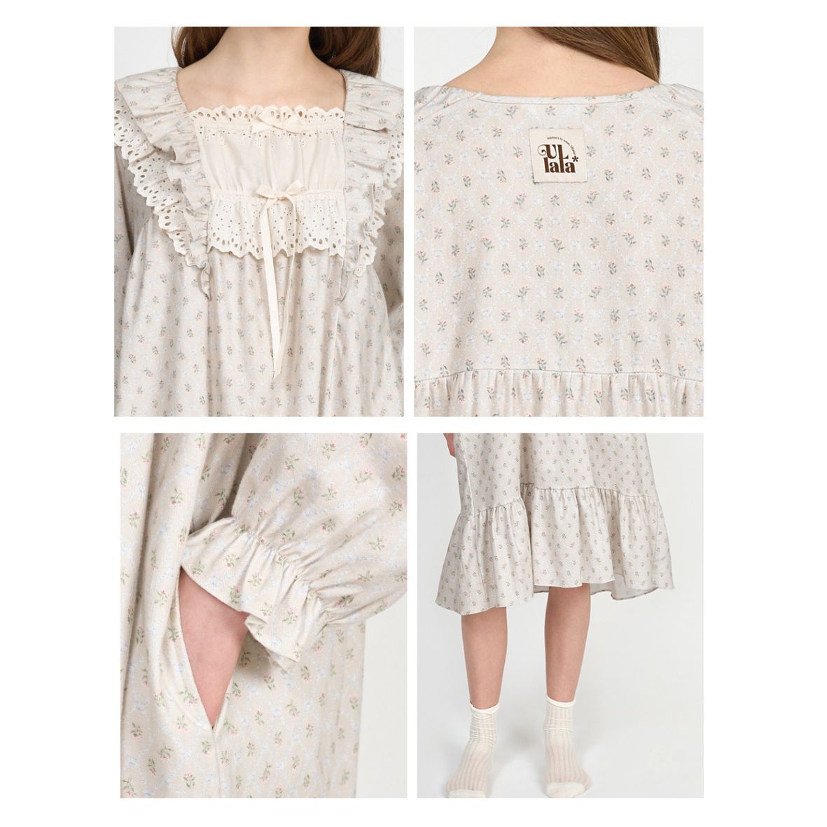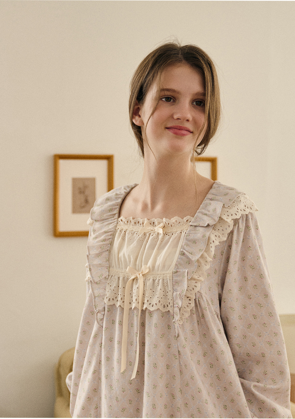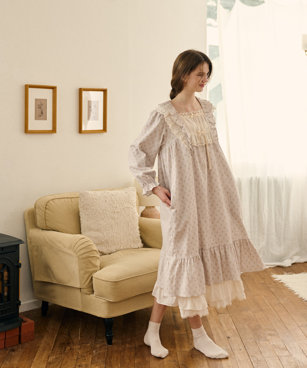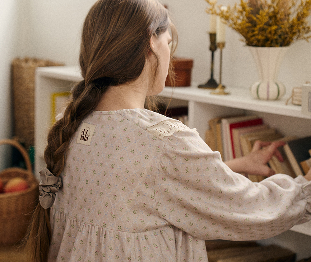 灰米杏基底細緻的小花印紋,像是被時間柔化過的色調,