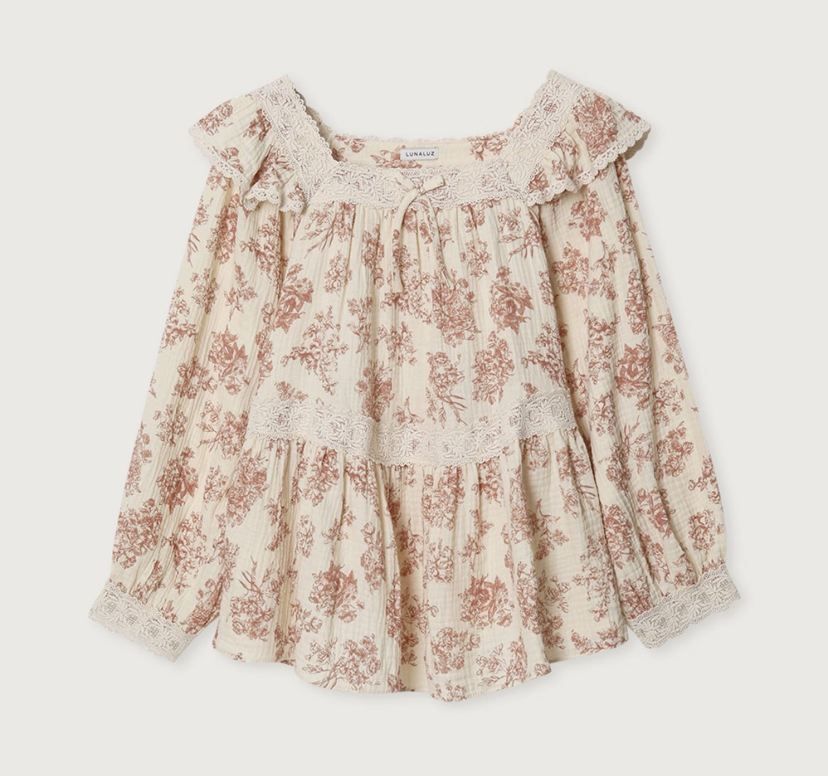 方領剪裁搭配細緻的刺繡蕾絲,營造出浪漫的層次。袖口飾有手工精緻蕾絲與束帶設計,提升整體高級質感。