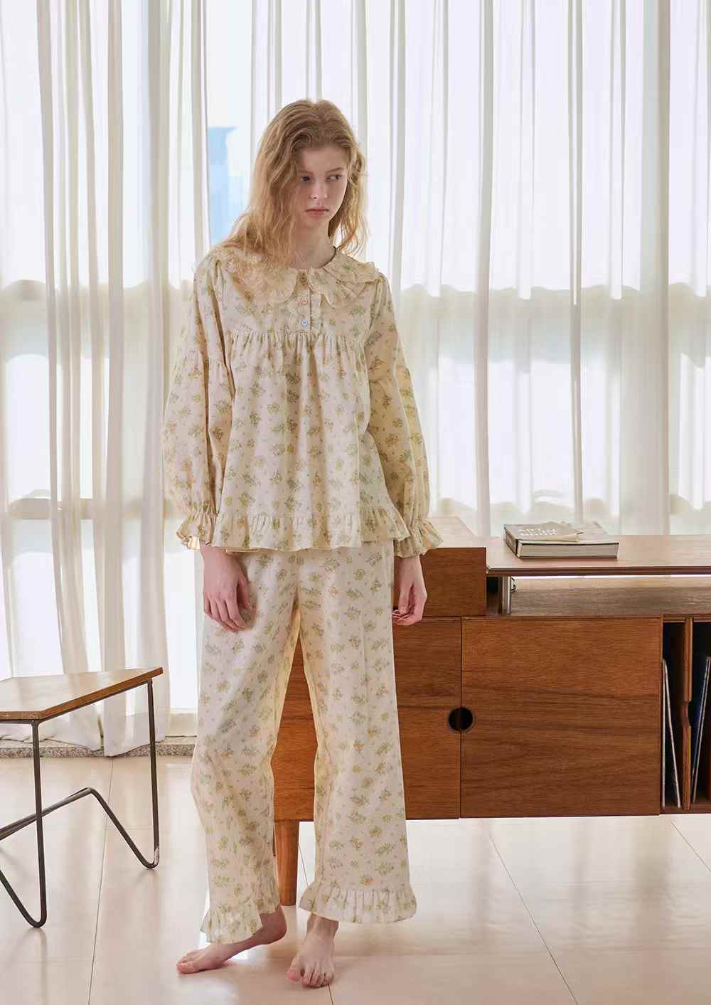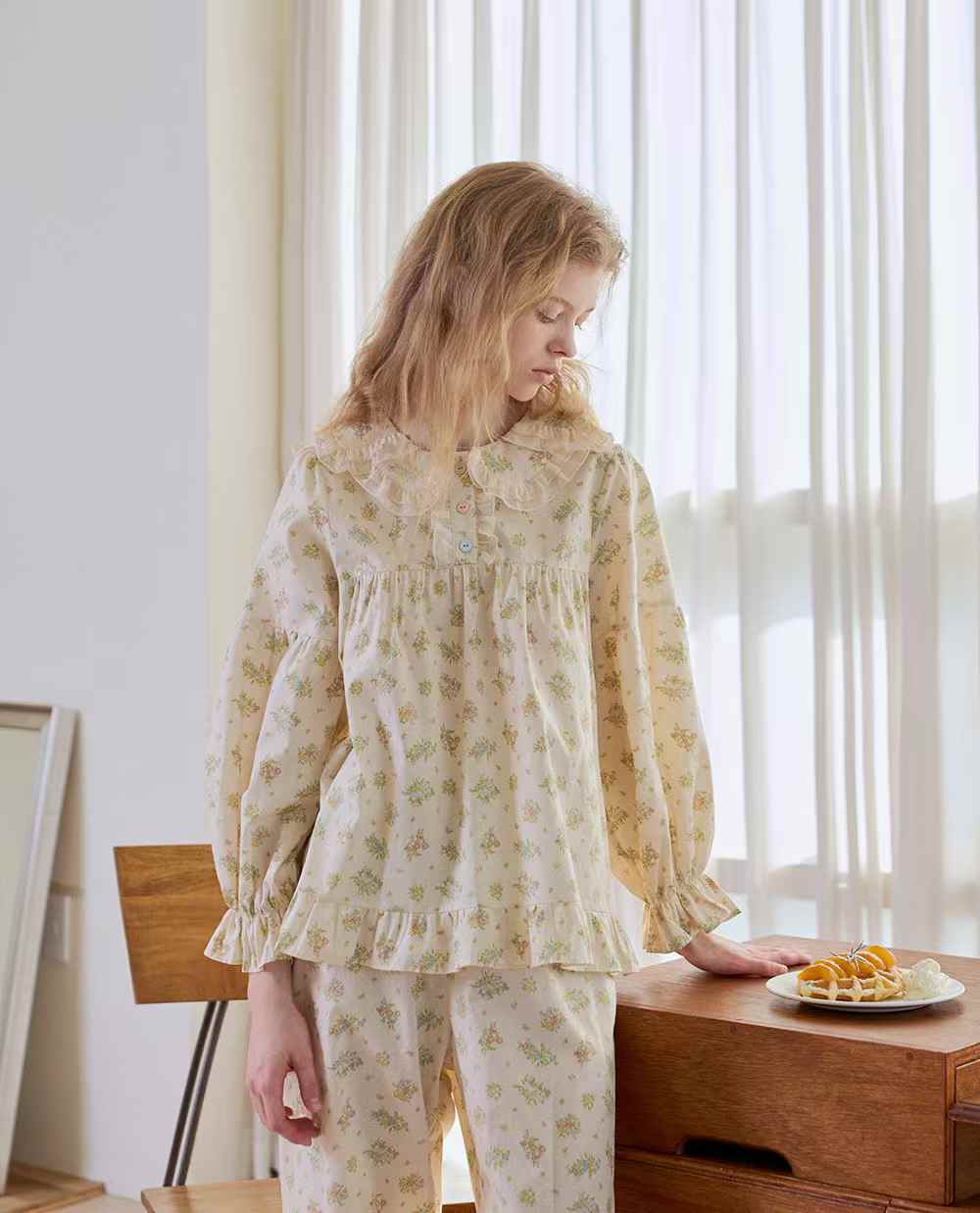袖口與褲腳以柔軟荷葉收邊,