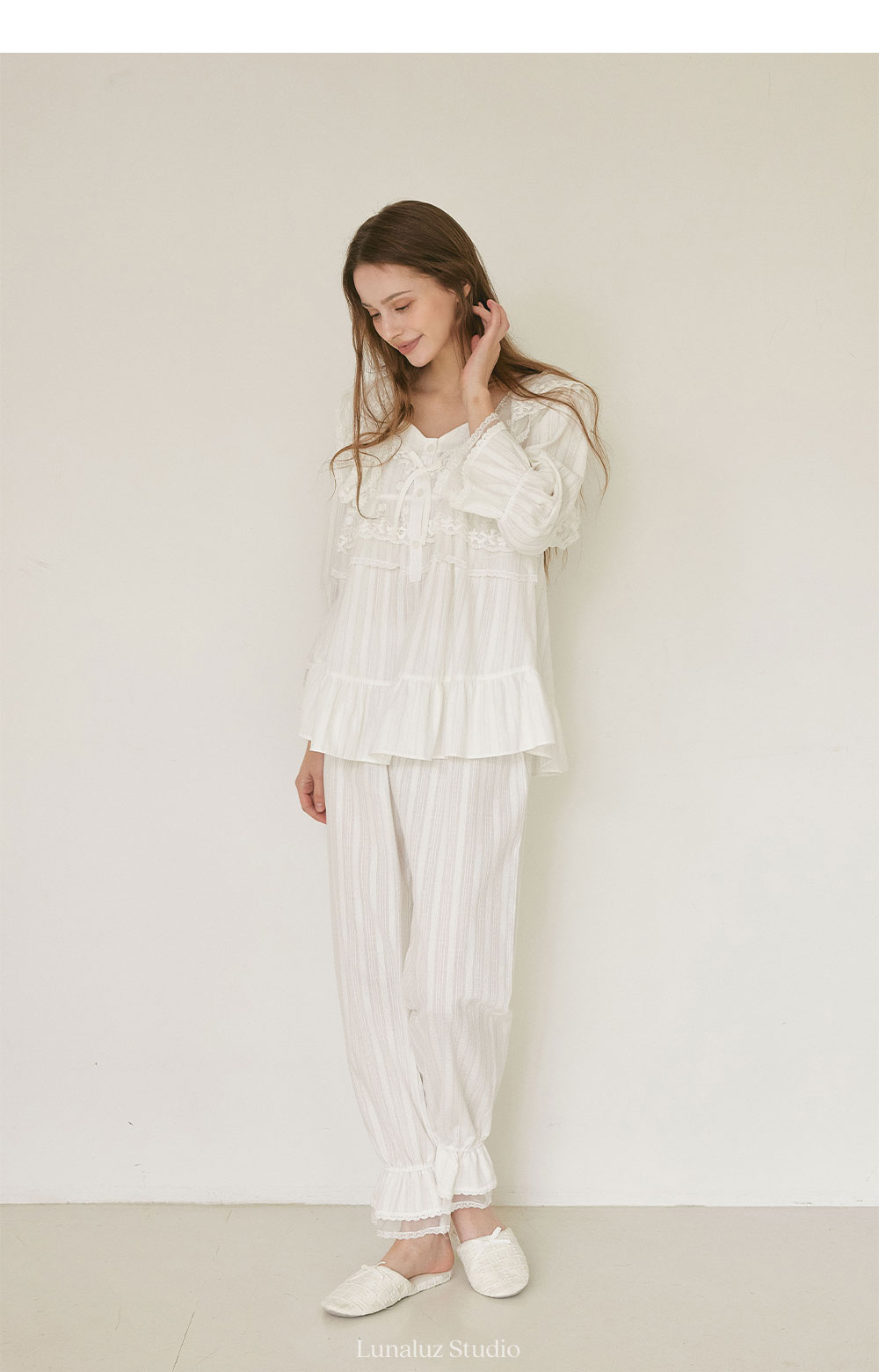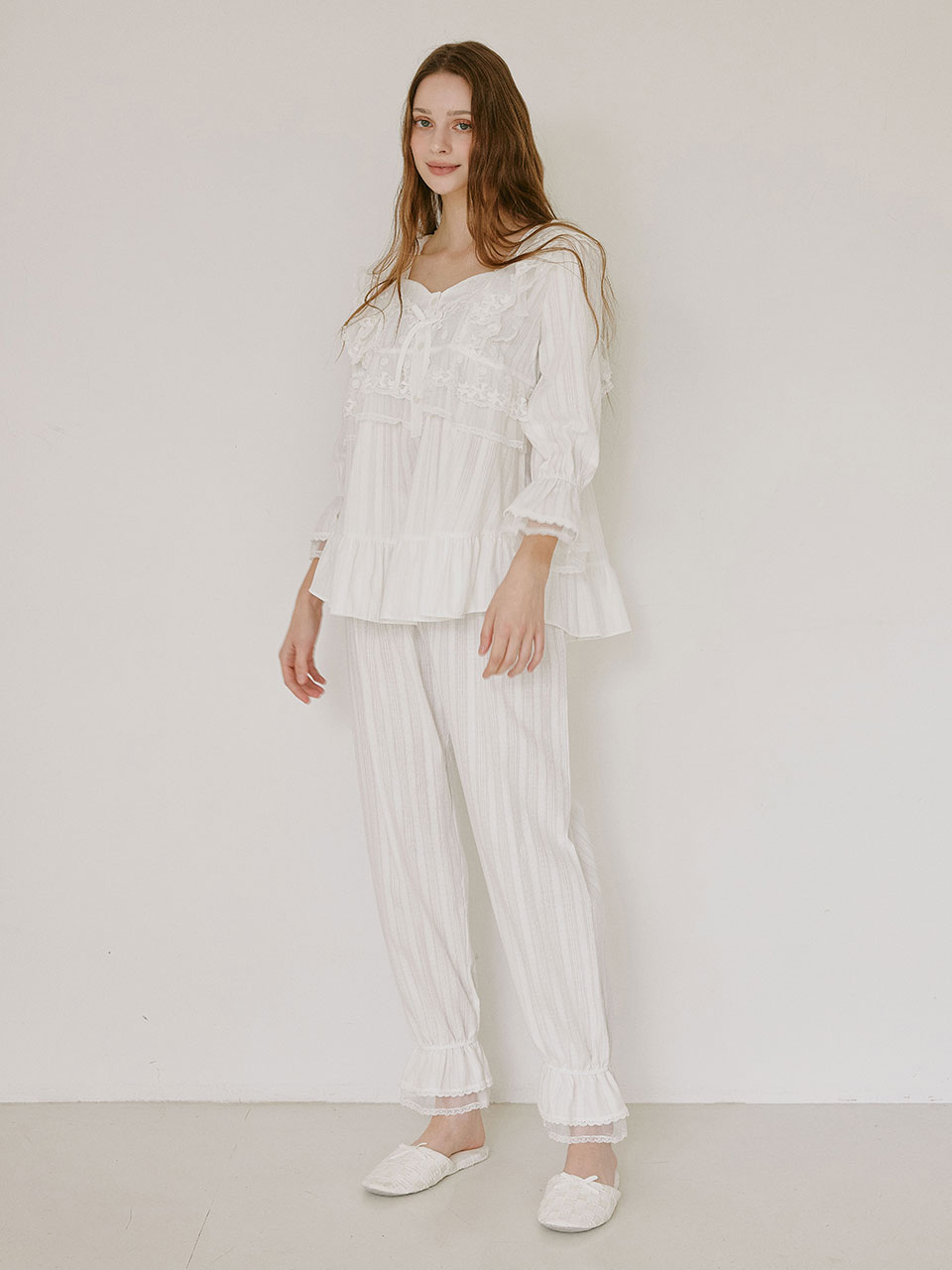 長袖袖口與褲腳以蕾絲與荷葉邊收束,