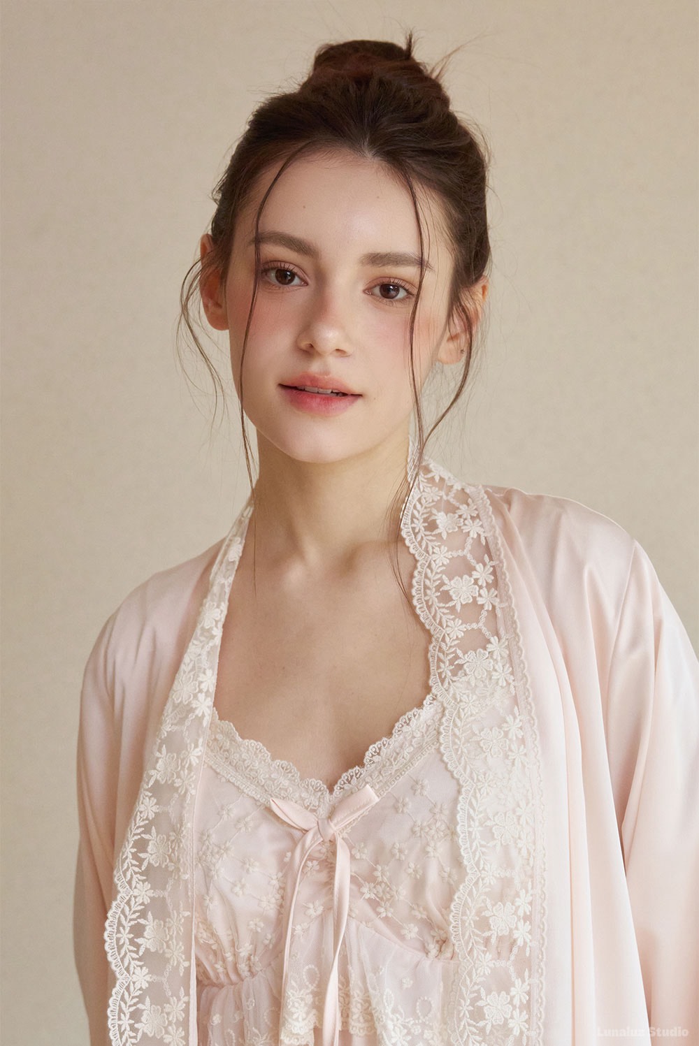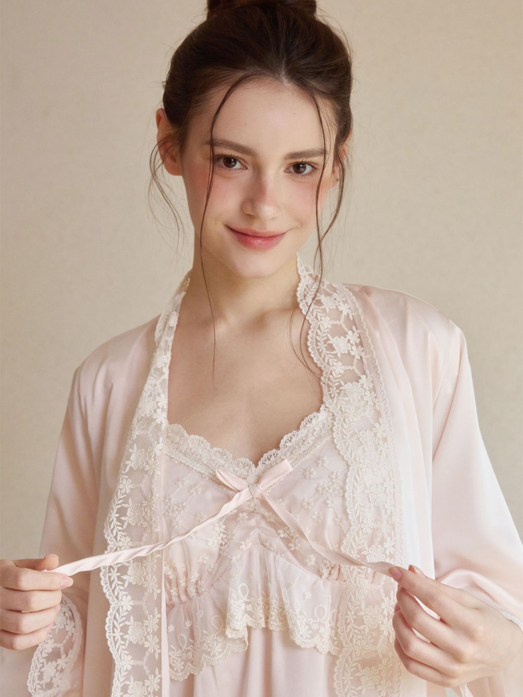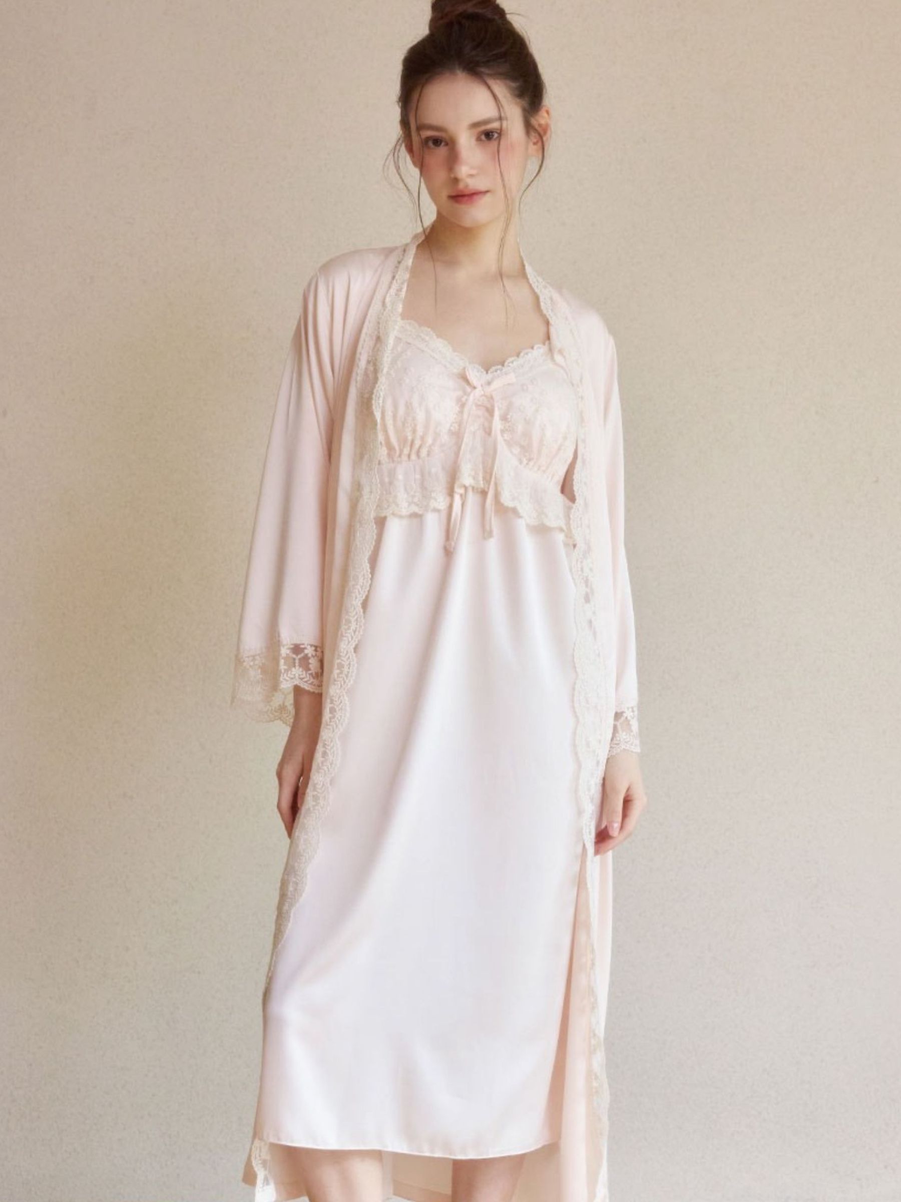 這款睡衣睡袍組以 柔霧緞面 × 精緻蕾絲 為核心,