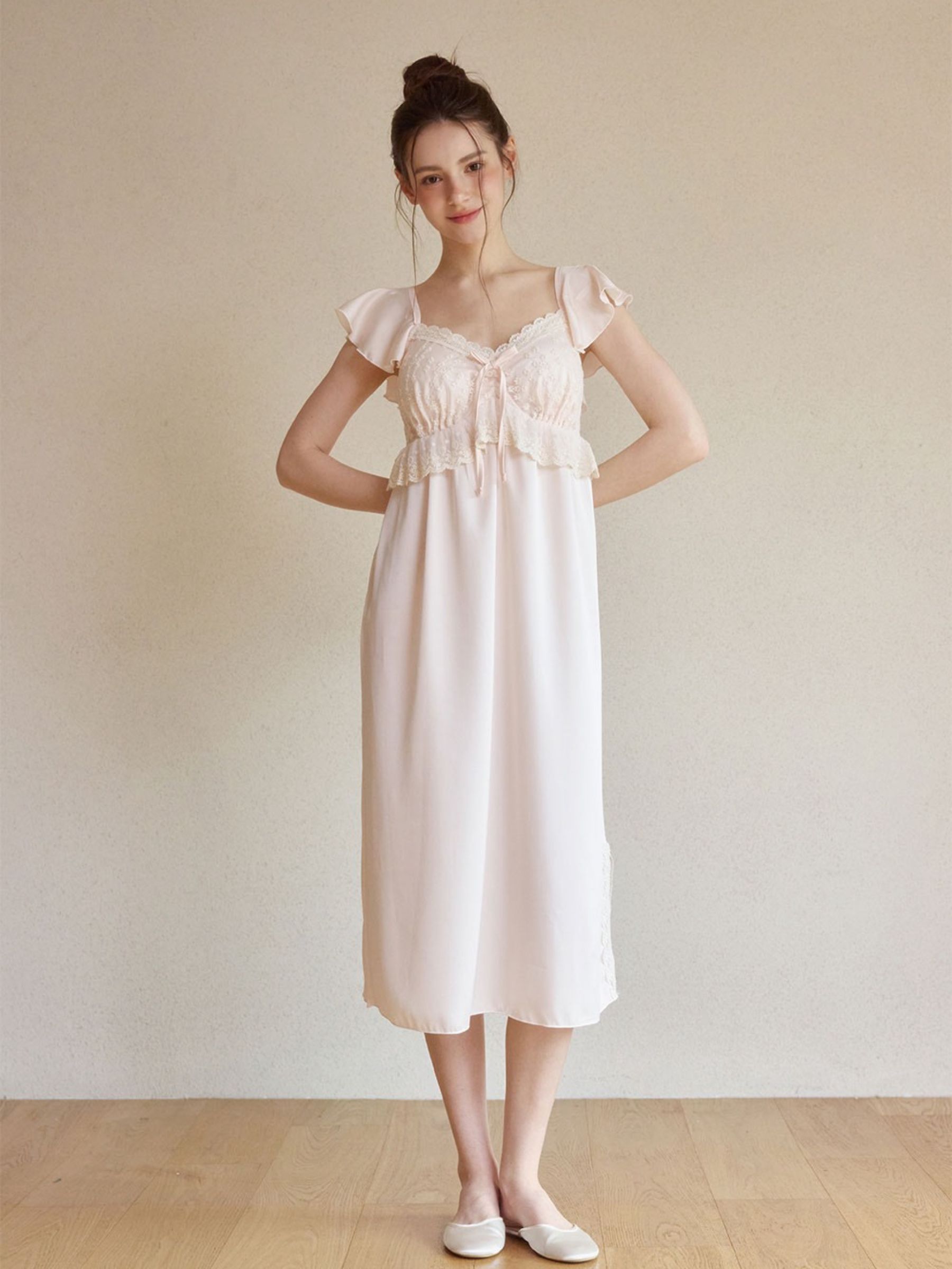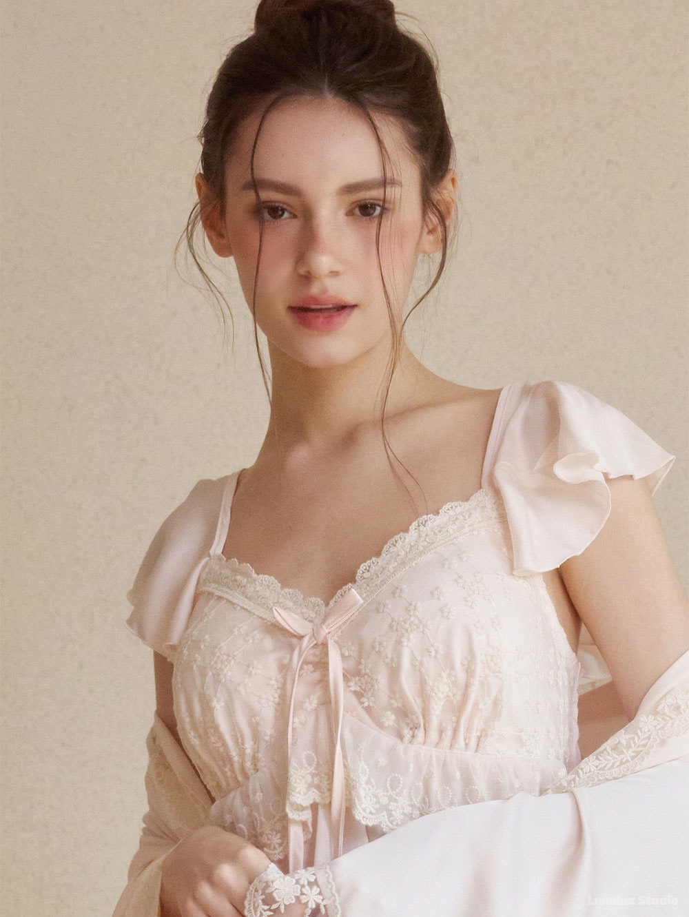 搭配胸前蕾絲與細緻綁帶,
