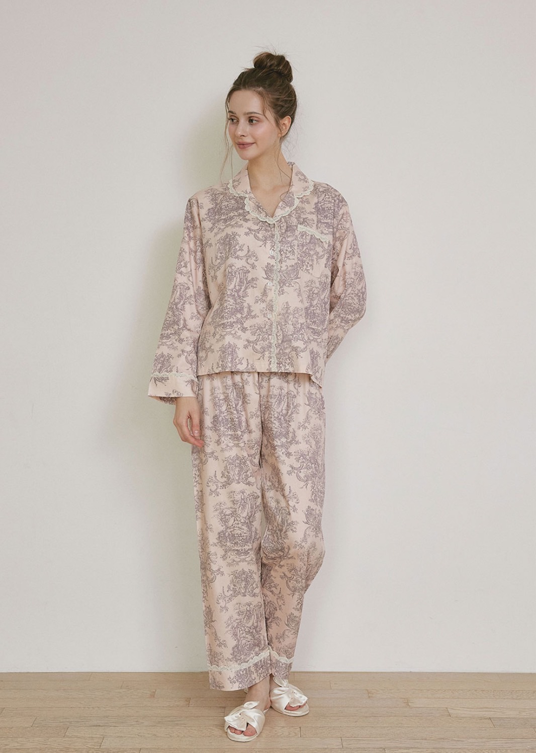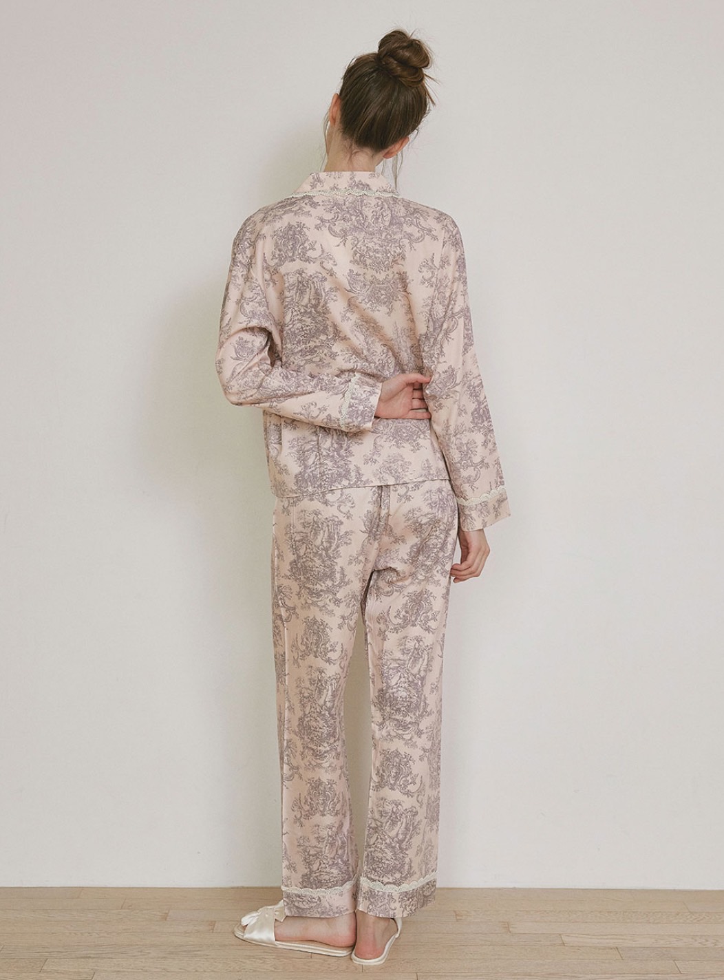 上衣以 精緻蕾絲滾邊 襯托古典朱依紋印花,